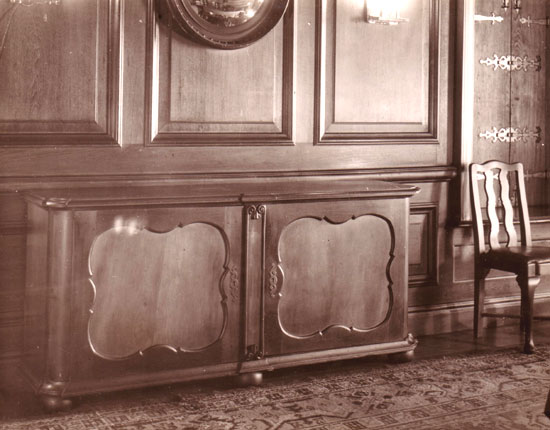 Photograph of a wood-panelled interior with a sideboard at Groote Schuur. The sideboard has doors with fielded panels, and three pairs of ball-shaped feet.