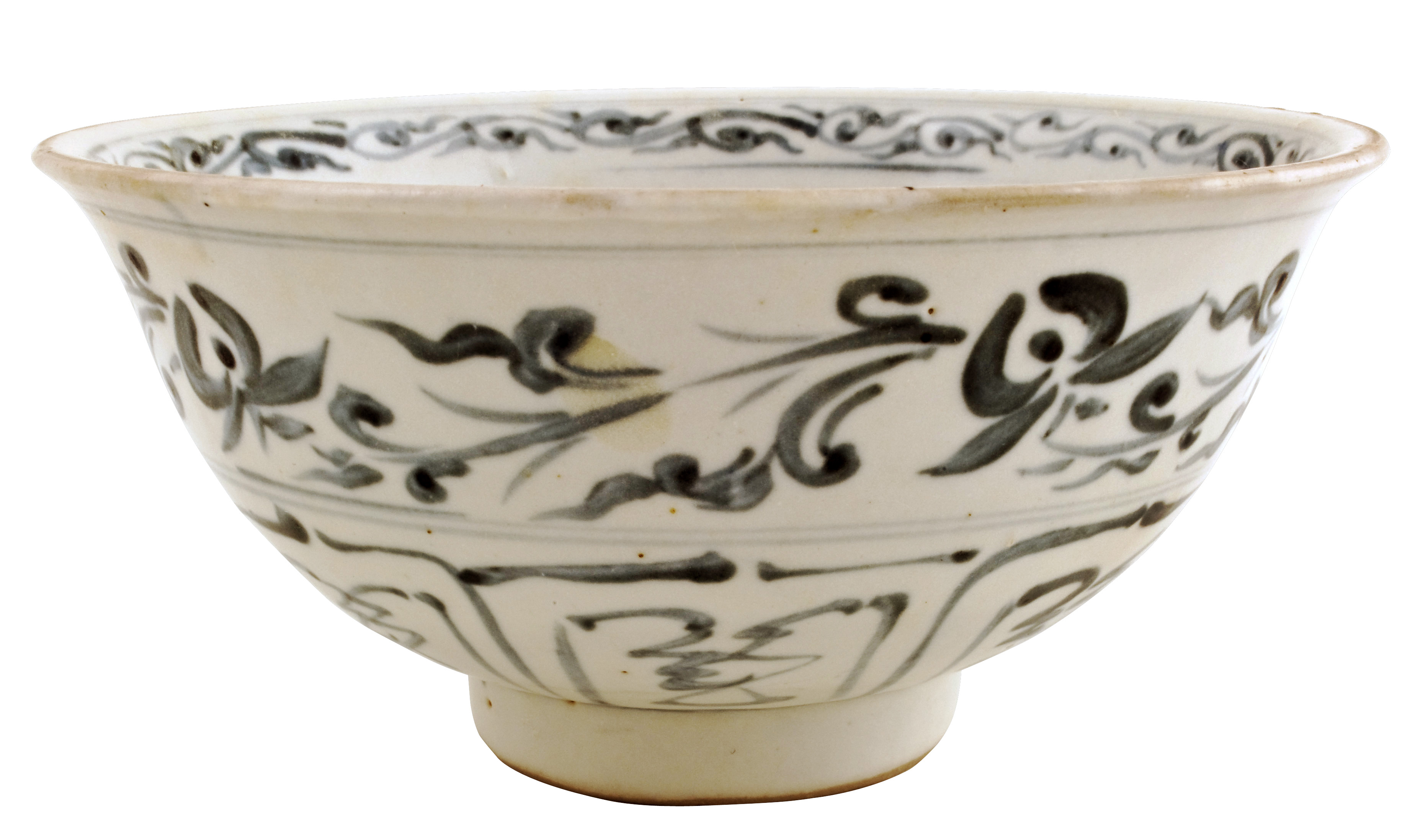 This porcelain Annamese lien-tzu-shaped bowl has a buff clay body decorated in underglaze blue with a floral scroll and lotus motif border on the outside and a sacred fungus scroll border and chrysanthemum panel on the inside. The base is sunken, partly glazed and unmarked. The name Annam designates various areas of what is today Vietnam. The Chinese used this name for this territory and it means “pacified South” The most important of the Annamese ceramic wares are the blue and white examples, such as the one exhibited here, which are related in both shape and design to the Chinese ceramics of the early Ming dynasty.