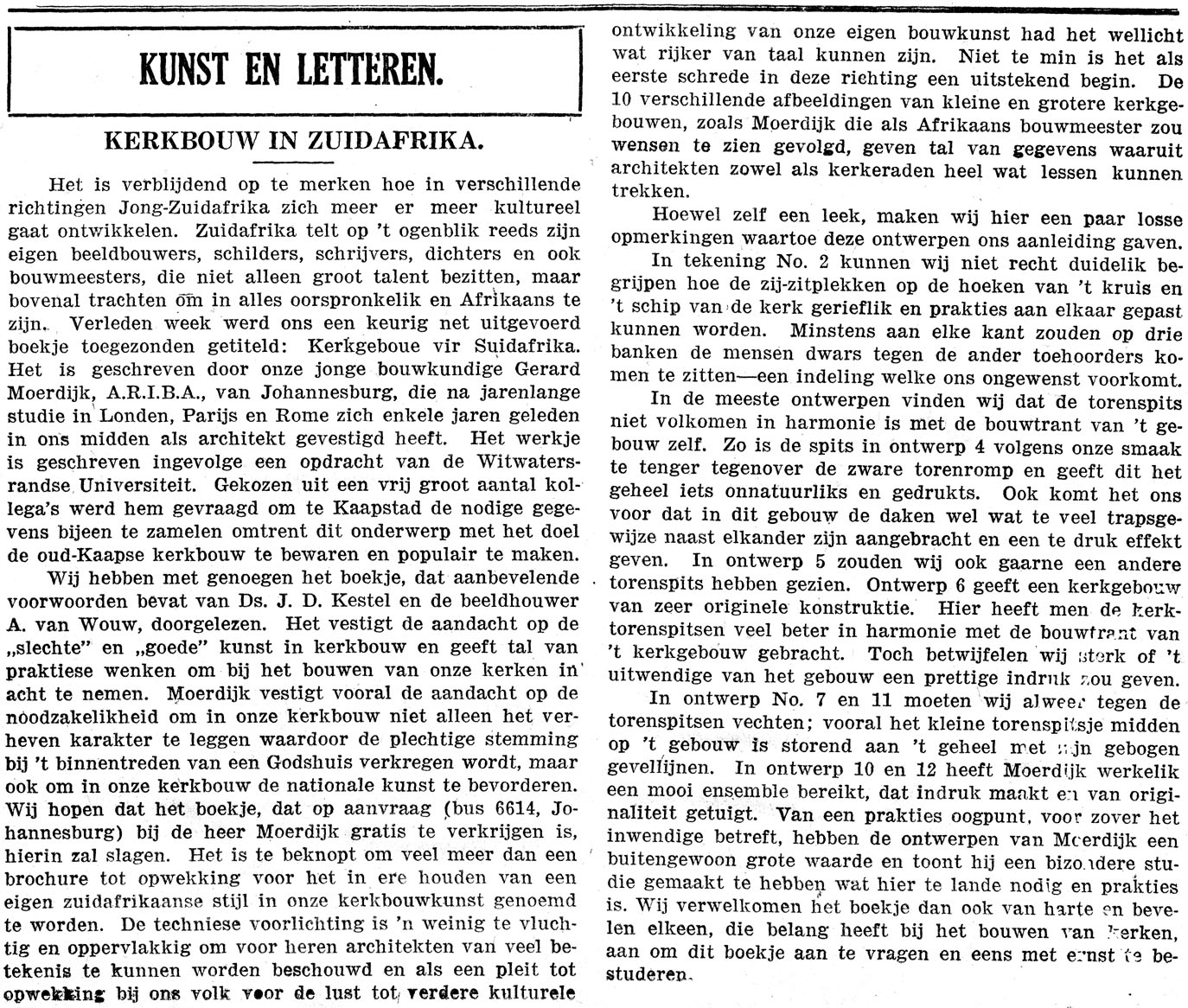 AFRIKAANS SUMMARY: Dit is verblydend om te sien hoe onder die Suid-Afrikaanse jeug 'n positiewe belangstelling in die skryfkuns, poesie en argitektuur ontwikkel. Hieronder ressorteer ook die jong argitek, Gerard Moerdijk, wat 'n boek oor die kerkboukuns in Suid-Afrika die lig laat sien het.