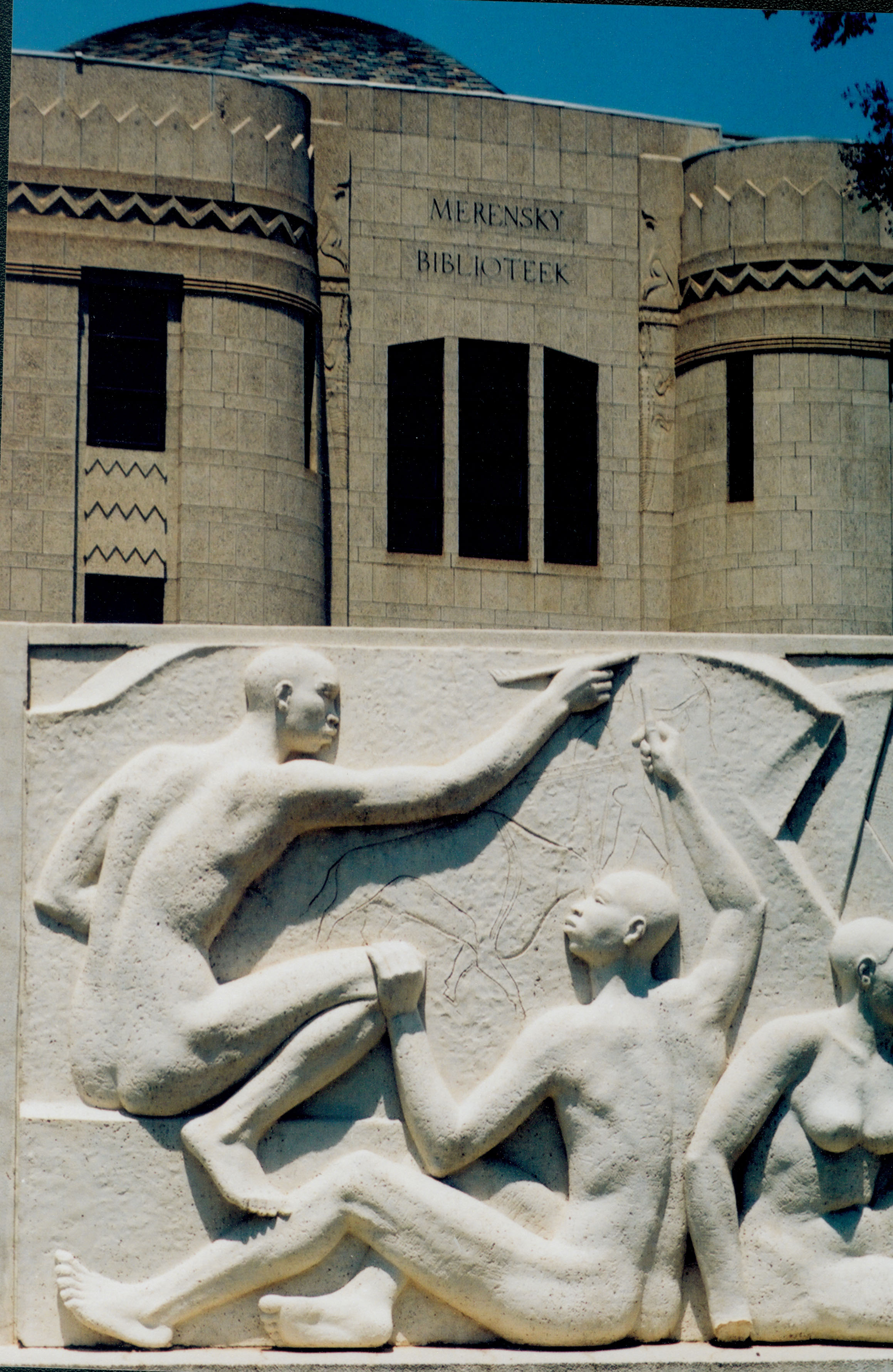 Close up view of the Old Merensky Library with an art piece, Hatfield Campus, University of Pretoria.