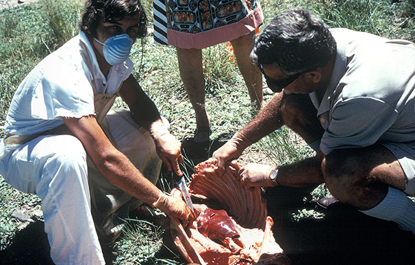 Rift Valley fever (RVF) outbreak : researchers with protective clothing performing a necropsy on an infected sheep