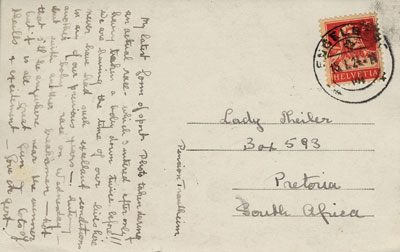 Postcard sent to Lady Theiler from Gert on 15/1/1924. Words on postcard: My latest form of sport. Photo taken during an actual race - which I entered after only having taken a boby down twice before!!! We are having the time of our lives here, never had such excellent conditions in any of our previous years. Entering another boby race on Wednesday - but with another breaksman - not that I'll be anywhere near the winner but it is all great fun & lots of thrills and excitement. Love Gert.