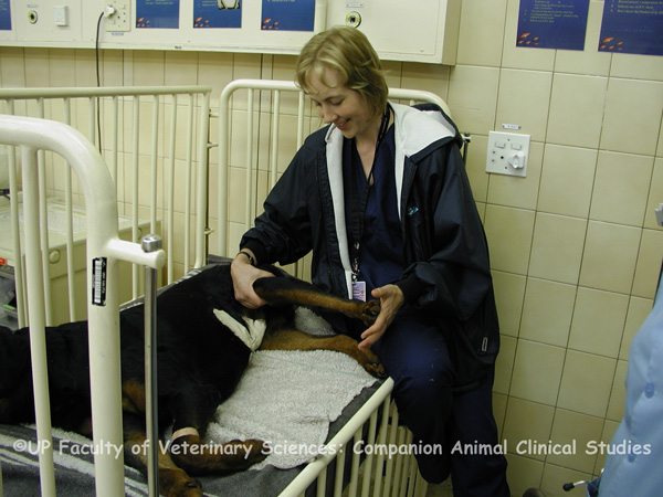 Physiotherapy is an important part of post operative care for patients who have undergone orthopaedic surgery. Physiotherapy is also indicated for acute neurological diseases, osteoarthritis, vestibular disease, soft tissue injuries and conditioning. Passive physiotherapy is the controlled stretching of muscles, tendons and ligaments to gradually increase the amount of movement in the affected limb. The joint is flexed and extended for a few minutes. Physiotherapy is used to maintain joint motion and patient comfort. Active physical therapy should begin during the first post operative week by helping the patient to stand. This increases muscle strength and tone. Swim therapy is also a useful form of physiotherapy. It is important to ensure that any surgical repair is stable prior to physiotherapy and that the patient’s condition is not worsening with rehabilitation.