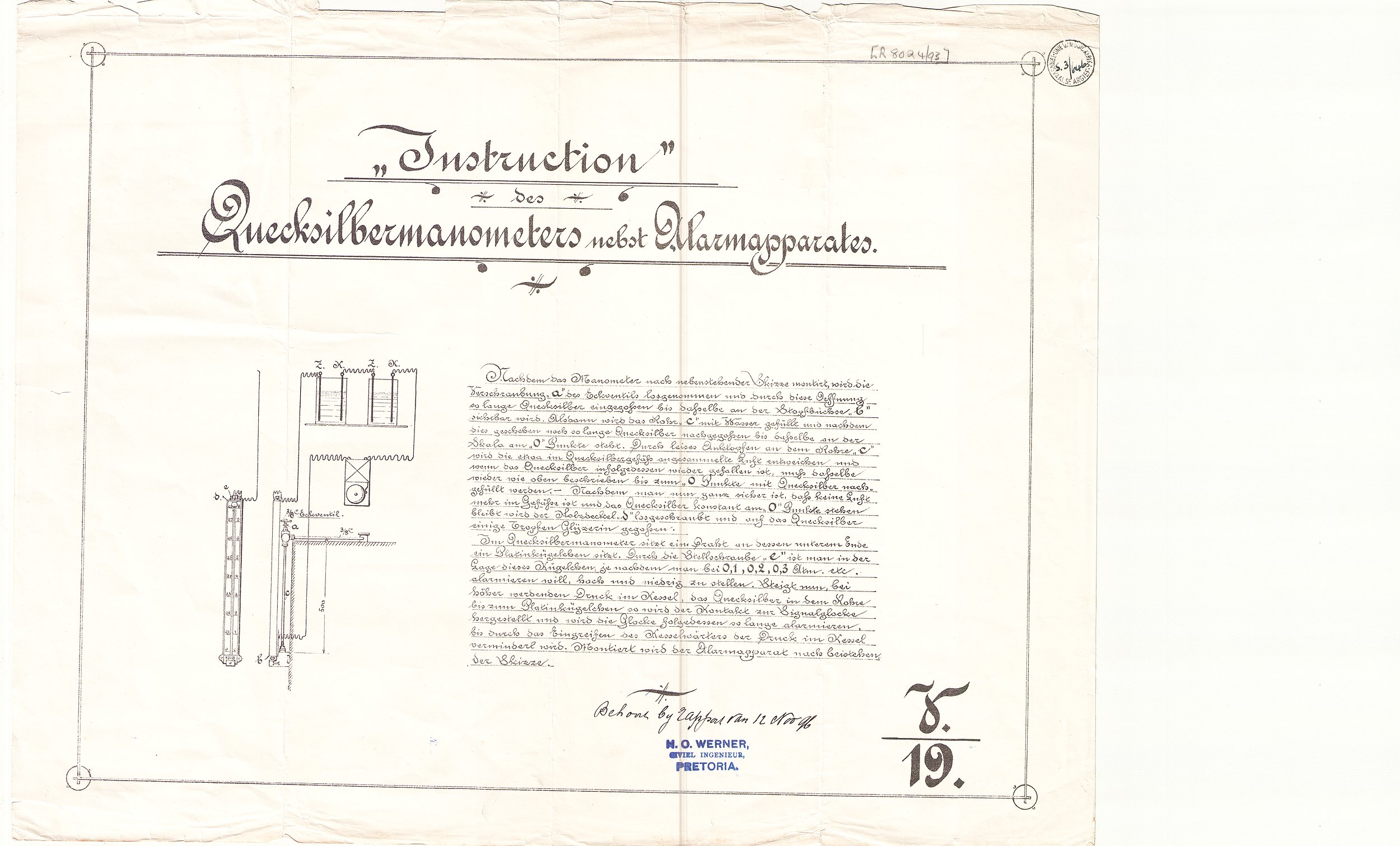 Digitised version of National Archive file S.3/646 of "Instructions des Quecksilbermanometer nebst Marmapparatus" by M.O.Werner, Siviel Ingenieur, Pretoria