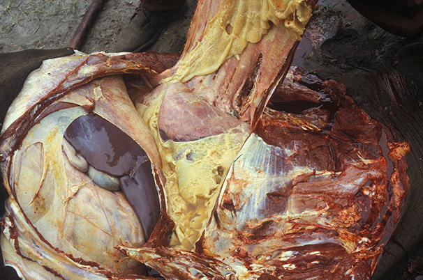 Acute contagious bovine pleuropneumonia (CBPP) : note severe serofibrinous exudation in the thorex