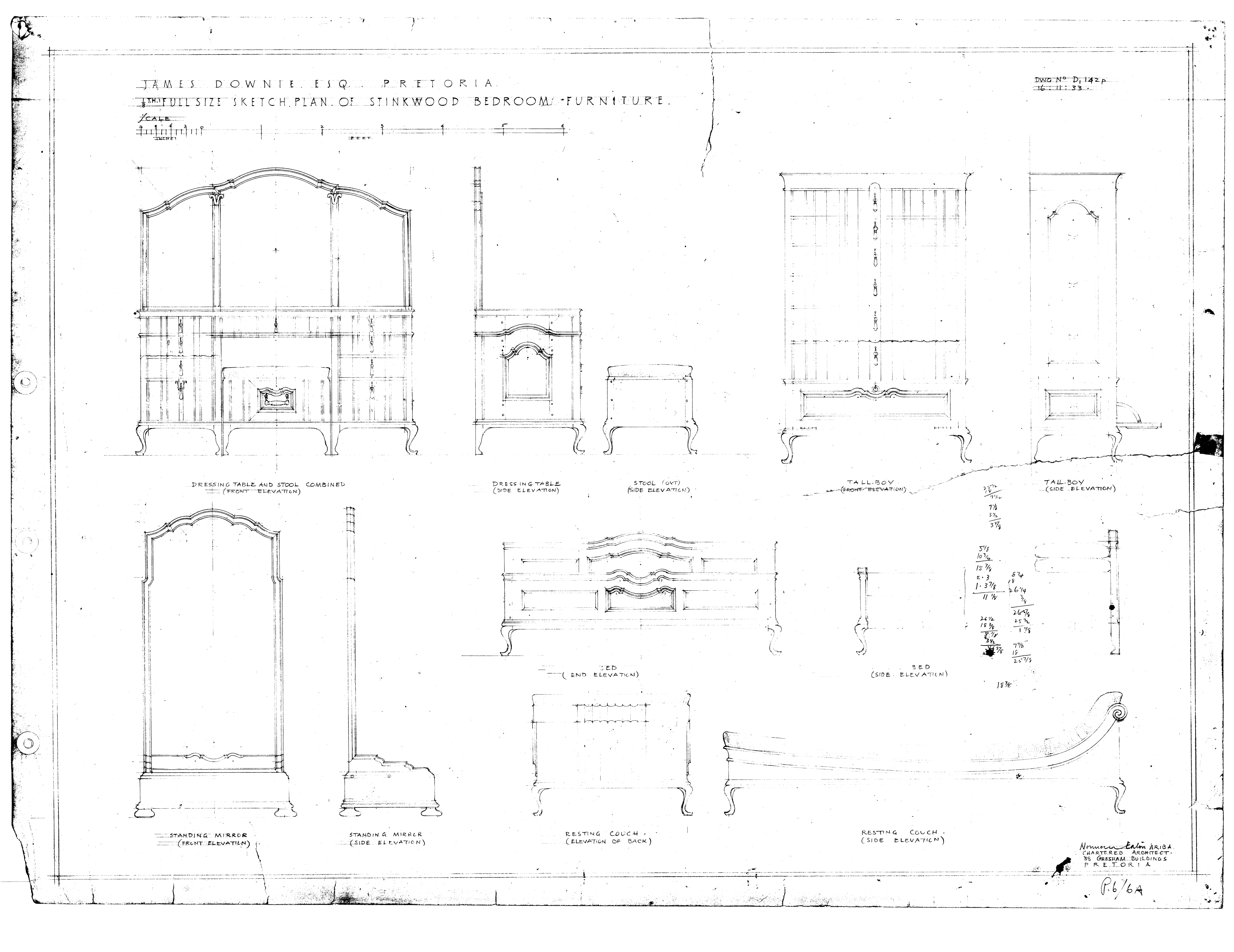 Furniture designs for James Dowie, Reitz Street, Pretoria from 1933 to 1936