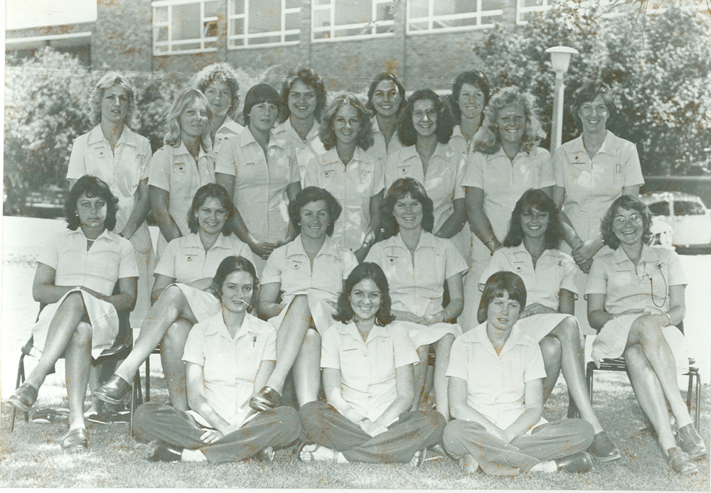 Formal black and white photo taken outdoors of the 1978 DVN class. The names of the veterinary nurses on the photo are: Front (from left to right): S de Wet, E Brune, N Dollery ; Second row: BM Haug, AE Botha, F Verster, VA Rennie, RS Stone, RE Duminy ; Third row: JE Arthey, LM Farrell, JR Cook, GM Dunstan, LM du Plessis, B Hartog, PEM Allison ; Fourth row: MA Groenland, E Alberts, DL van Dyk, KMS Barker