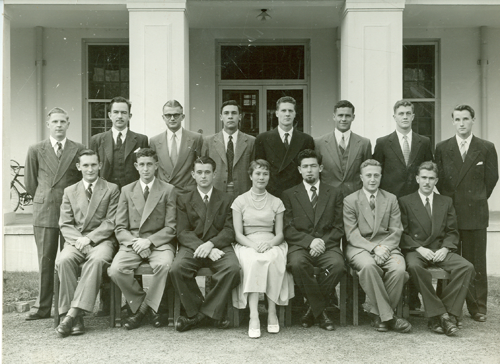 The photograph of the veterinary graduandi of 1956 is a formal black and white group photo. The only women in the class, Lorraine Albré de Jager, was born on 27 October 1933. She was the 7th woman to qualify as a veterinarian. Her interest in veterinary medicine evolved from the dedicated care of a pup with distemper as a 10-year-old girl to the realisation of a dream of becoming a veterinarian when she was admitted to the Onderstepoort Faculty in 1954.