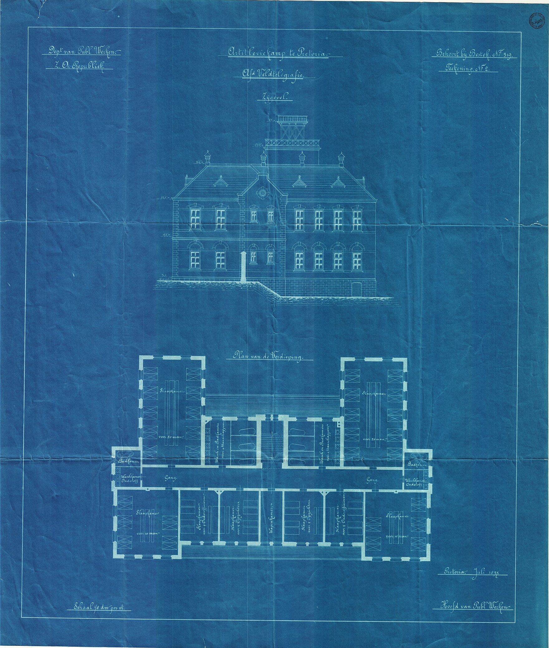 Digitised version of National Archive file S.2/233. Drawings of the "Zygevel. Plan van de Verdieping" (Side Gable. Plan of the Storey) of the Field Telegraph buildings at the Artillery Camp, Pretoria