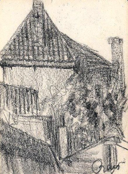Charcoal sketch by Reus of a large house in the background with the chimneys of two other houses right in front of it. On the back is three lines that was made by the artist.