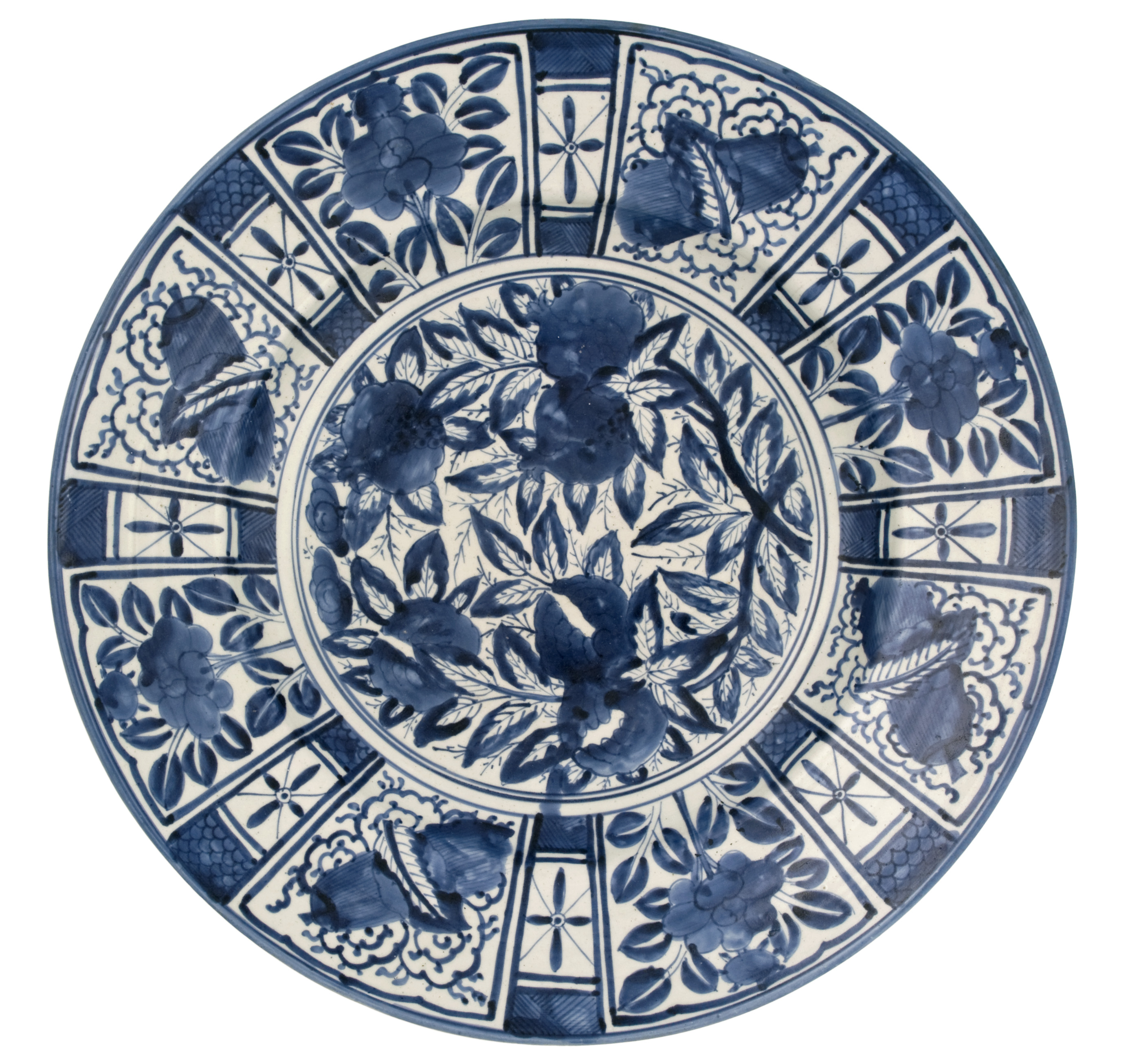 This large Arita porcelain charger is decorated in underglaze blue-and-white with five pomegranates and leaves in the central panel, surrounded by sixteen panels of flowers, Buddhist symbols and formal designs in the kraak style. The base is sunken, glazed and unmarked. This charger is considered one of the largest of its kind made. The influence of Chinese Wan Li (1573-1619) decoration on this charger is unmistakable. This is the kind of dish the Japanese produced for the VOC when they were requested to produce porcelain as the Old Chinese porcelain. The Chinese kraak style was mostly used on open forms.