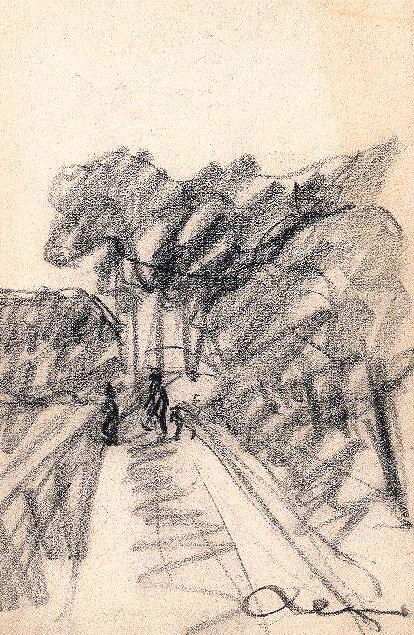 Charcoal sketch by Reus portraying two people talking, one with a dog, on a farm track between a fence and trees with a house in the background.