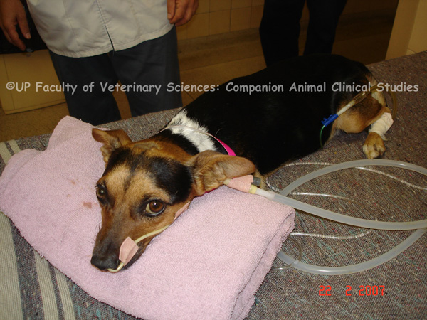 PHOTOS 1-5: Many critical illnesses can cause hypoxia to occur and oxygen supplementation may be necessary to improve oxygen delivery and to prevent lactic acidosis. A nasal cannula is the best way to supplement oxygen in conscious patients. Oxygen supplementation is an important management tool for critical conditions such as cardiopulmonary disease, sepsis, SIRS and head trauma. Nasal cannulas are easy to place, require minimal equipment and are well tolerated by patients. To place a nasal cannula, the patient's nasal passage is anaesthetized and the correct length of tube is measured from the nostril to the medial canthus of the eye. The lubricated tube is gently inserted into the ventral nasal meatus and is secured adjacent to the nostril with suture or staples. Sneezing and intolerance can be alleviated by reapplying the topical anaesthetic or pushing the nasal cannula into the nasopharyngeal region. An Elizabethan collar can be used to prevent the patient from dislodging the nasal cannula. A nasal cannula allows for prolonged oxygen delivery and permits access to the patient for examination and treatment purposes without losing the oxygen rich environment. A disadvantage of using a nasal cannula is that the fraction of inspired oxygen cannot always be determined accurately. The necessary oxygen flow rate is based on patient size, respiratory rate, respiratory pattern and the degree of open-mouth breathing. If a unilateral nasal cannula is used it should be replaced with a new cannula on the opposite side every 48 hours so as to reduce damage to the airway. Most animals tolerate the cannula well.
