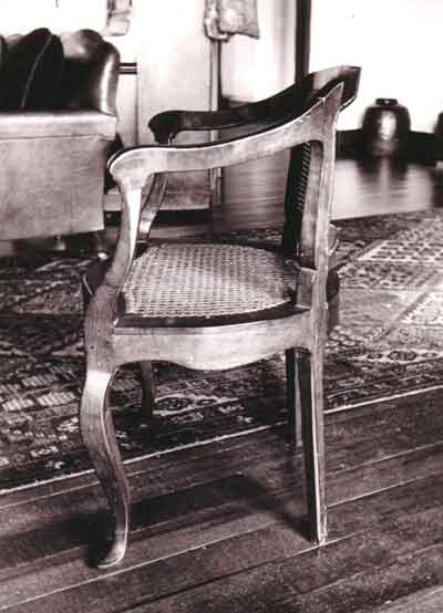 Photograph depicting a mid-18th century cane chair belonging to Major Jardine. It has curved legs and club feet. Note that only the backrest and seat are caned while the sides are not. It appears to be the same piece shown in Fig. 68 on p. 56 of the 1960 edition of "Eighteenth Century Furniture in South Africa", by G. E. Pearse.