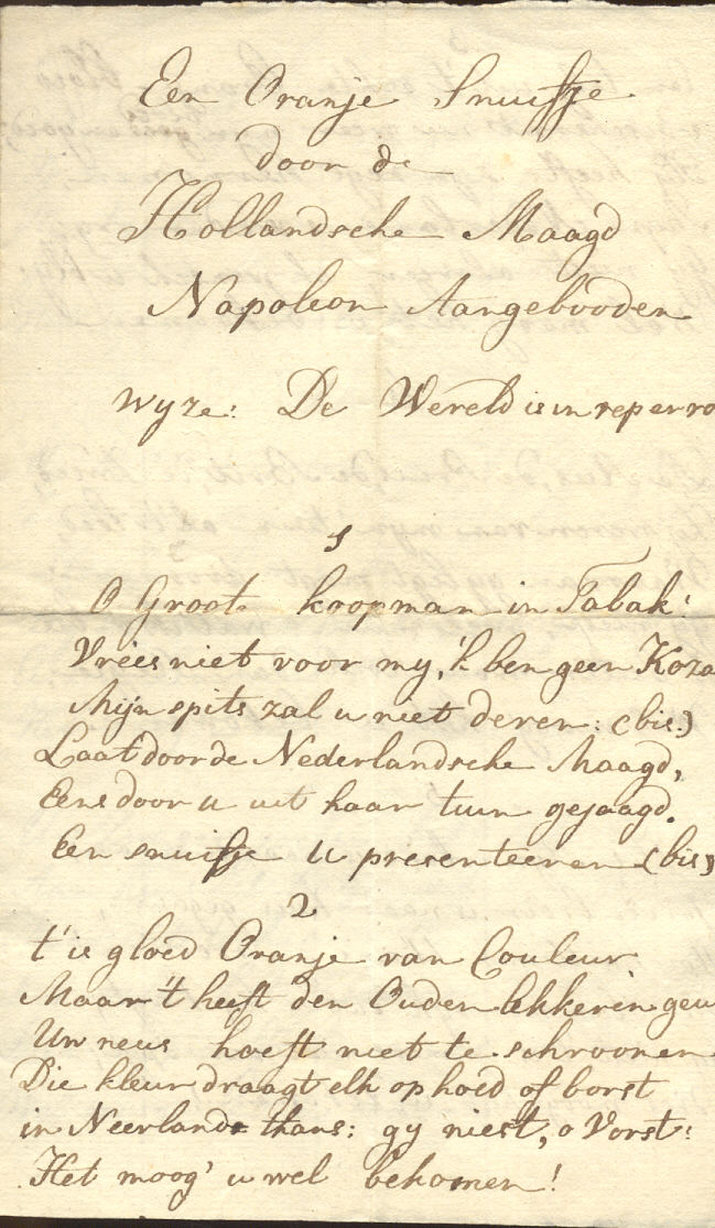 Een Oranje Smuitje door de Hollandsche maagd Napoleon aangeboden