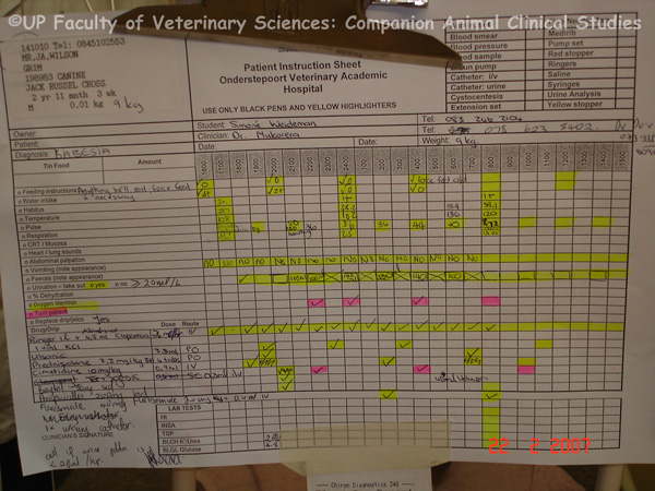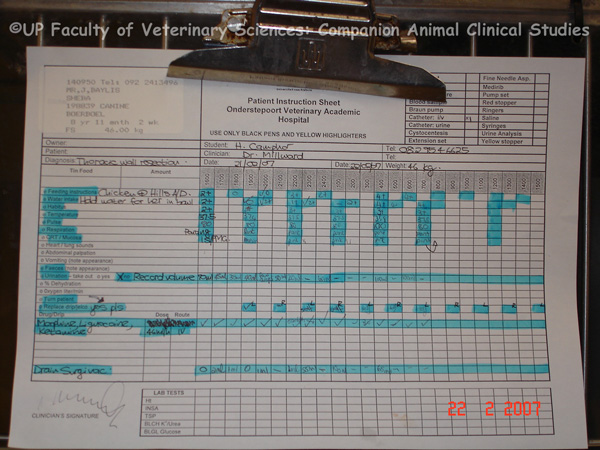| dc.description.abstract | PHOTOS 1-4: Monitoring sheets are important tools in an animal hospital. They provide a basis for planning patient care and aids in communication between members of staff. Furthermore, it serves to monitor a patient’s progress during a stay in the hospital. Information on the sheet should include the following: contact details of the owner, description of the patient, the names of the attending student and veterinarian, the dates and diagnosis. | en |