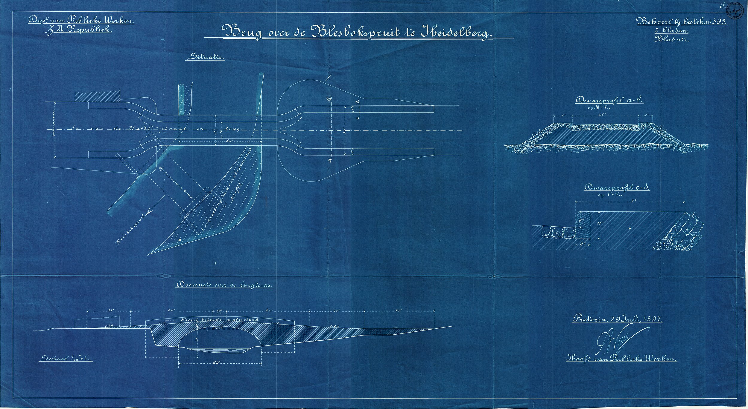 Digitised version of National Archive file S.2/241. Drawings of the bridge across the Blesbokspruit, Heidelberg. "Situasie: Doorsnede over de lengte-as" (Location: Section over the longitudinal axis). Signed by "S.W. Wierda, Hoofd van Publieke Werken"