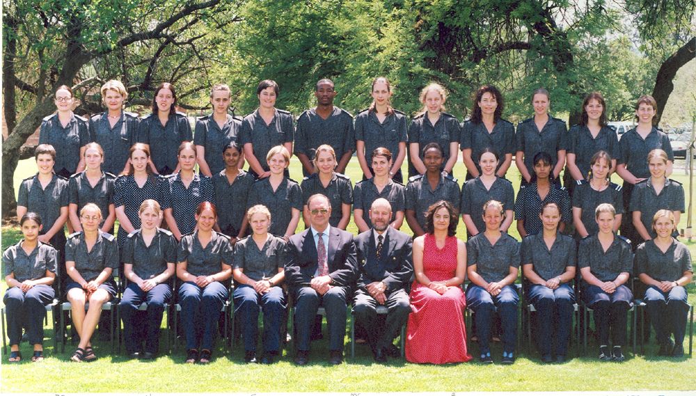 Formal colour photo taken outdoors of the 2002 DVN class with Prof NPJ Kriek (Dean), Prof HM Terblanche (Deputy Dean) and Dr E Scheepers. The names of the veterinary nurses on the photo are: Front (from left to right): ZF Lorenz, N de Jager, C van Aswegen, MC MacKenzie, B Brown (Class representative), Prof NPJ Kriek (Dean), Prof HM Terblanche (Deputy Dean), Dr E Scheepers, EJ Roodt, L Watkins, SE Rotherham, M Haasbroek ; Second row: M Groenewald, RA Hooijberg, L Badenhorst, CM Tomada, D Pillay, MC van de Wetering, A Pieterse, M Barnard, NB Mtshali, CA Claassens, A Singh, JK Colvin, ME Aartsma ; Third row: LP Marais, L van Rooyen, SM de Connick, A Verbeke, V Snyman, MP Maubane, MW Maeck, CL de Wet, C Heine, Z Schalekamp, JH Vermaas, A Becker