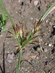 BOTANICAL DESCRIPTION: Cyperus esculentus Yellow nutsedge (English), Geeluintjie (Afrikaans). General: This grass-like herb has perennial rhizomes with roundish tubers. Grows up to 600 mm. The annual aerial stems are 3-angled. Young plants are yellowish-green. Leaves: Shiny leaves that look like grass. Flowers: Branched head with 3 - 5 leaf-like bracts and light brown spikelets in clusters. July - May. Festuca spp. Fescue grass (English) Swenkgras (Afrikaans). General: This is a tufted perennial grass. Leaves: Leaves often have a small lobe or ear at the base, and old leaf sheaths usually split into fibres. Flowers: The inflorescence is an open or contracted panicle. The spikelets are laterally flattened. Lolium spp. General: An annual, dense, tufted, soft grass. Leaves: The leaves are green and shiny and the culms usually unbranched. Flowers: The inflorescence is flat with the spikelets evenly arranged on either side of the central axis. The size of the awns is up to 10 mm, which distinguishes it from Lolium perenne.