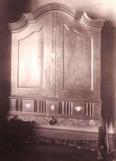 | dc.description.abstract | Photograph depicting a cabinet on stand type cupboard with a gabled pediment from Groote Schuur, probably from the third quarter of the 18th century. The lower part has one drawer with a partial linenfold pattern. The cabriole legs have carving on the knees continued on the apron. The legs terminating in ball and claw feet are connected by a shaped X stretcher. | en_US |