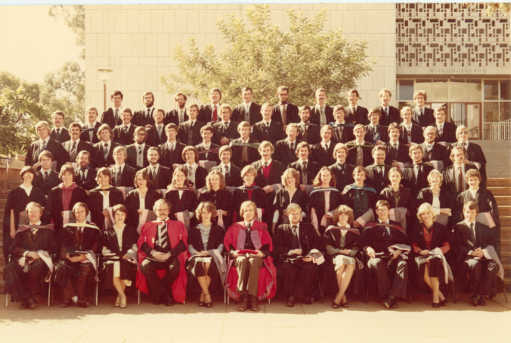 Formal colour photo taken outdoors of the 1980 BVSc graduates. The names of the graduates with Dr AC Henning and Prof BL Penzhorn are: Front (from left to right): AD MacWhirter, JH Brown, G Roche, Dr AC Henning, Z Goldswain, Dr BL Penzhorn, NL Davies, AM Cunningham, R Strydom, CD van Aardt, PH Ward ; Second row: P Kitshoff, EJ Marais, SC Davey, U Handschin, LA te Brugge, SE Murray, LA Woodward, LC Moriarty, GE Coombe, SM Higgerty, ASK Aitkenhead, P Hunter, M Eybers ; Third row: JA Kilian, CD Steijl, RE Schmid, RD Paskin, RD Bruning, PT Oberem, AD Grace, MCM Guiney, J Malan, GPV de Cort, PM Kretzmann, WJ Schack ; Fourth row: QC Beningfield, CC Niebuhr, AR Ortlepp, KMA van Laeren, P Stadler, RD van Niekerk, D Rodenwoldt, PM Dommett, JC van Niekerk, RHP Reuvers, GW Tedder, AS Voigts, JLJ Rokebrand ; Fifth row: DJ Midgley, CJ van Zyl, GJ Labuschagne, E Dyason, R Mentz, OKP Störzner, MC Coghill, RD Gottschalk, PF Steyn, HB Groenewald, RJ Milner, E Dey-van Heerden ; Sixth row: SJ Joubert, PC Jurgens, CD O’Connor, NR Weyer, CT Costello, R Campbell, AM Theron, A McDonald, J Lax, RG Paladin ; Absent: GR Archibald, REJ Burroughs, AC de Beer, WH Delport, DP du Plessis, AS Hancox, RH Katzwinkel, S Kramer, AR Menache, JO Nöthling, BA Sender, S Smith, E Swanepoel, JJ van Niekerk, A van Vollenhoven, A Weissberg