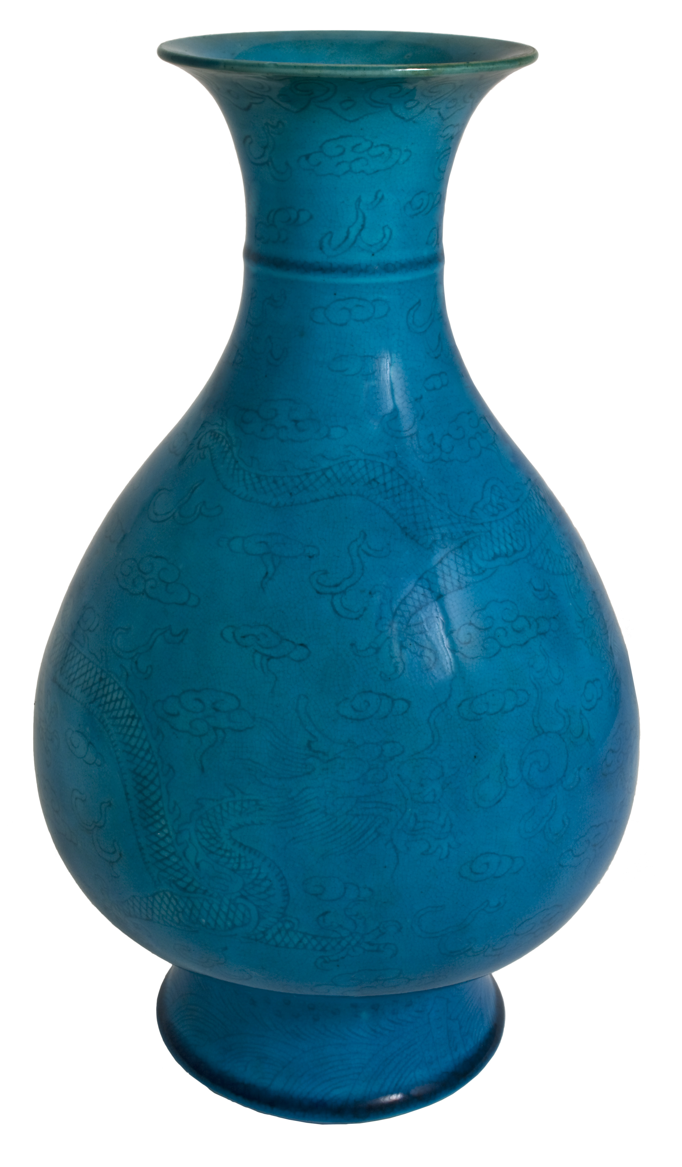 This round pear-shaped vase with a turquoise glaze on a beige clay is decorated by two five-clawed dragons, each chasing a pearl among clouds incised into the pot under the glaze. There is a ruyi pattern around the flared lip and a wave pattern around the base under the glaze. The base is sunken, glazed and unmarked. While copper in a lead-fluxed glaze will usually produce a green glaze, in an alkali-fluxed glaze a brilliant turquoise such as on this vase can be achieved. The clear brilliance of this glaze appealed to the Emperor Qianlong, who appointed the Superintendant Tang Ying at Jingdezhen to produce such perfect monochromes.