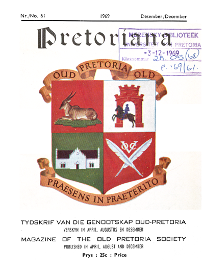 Nogmaals die Staatsgimnasium / F.J.du Toit Spies -- Two interesting facts about the Old Government Building -- Kunsvriende in Suid-Afrika / J.F. Marais -- Die straatname van die Pretoriase voorstad Danville / G.J. van Eck -- Uit die geskiedenis van 'n kerkklok / F.J.du T. Spies