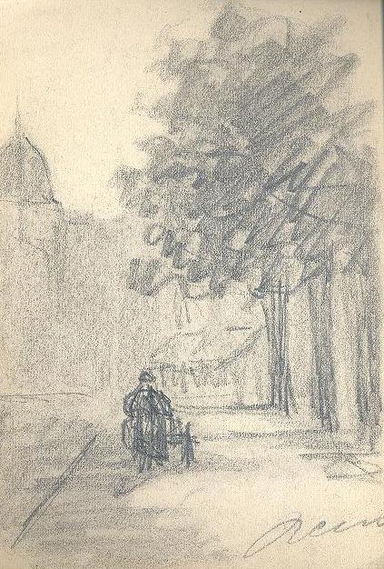 Charcoal sketch by Reus of a woman with a cart walking down a road (Maartensgat) in Dordrecht, to the right a lane of trees and to the left in the background, the tower of De Grote Kerk.