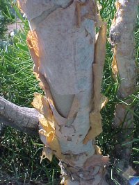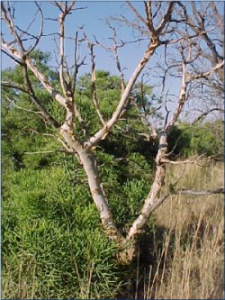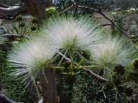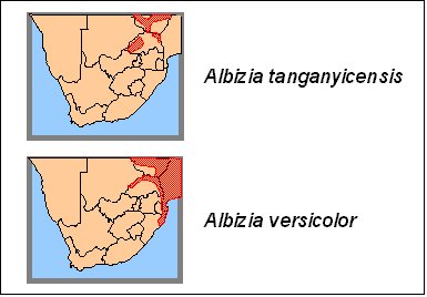 Botanical description: Albizia tanganyicensis General:A small to medium-sized tree with a somewhat sparse, rounded or flattened crown. Bark is very distinctive: smooth, creamy white, peeling off in large reddish or yellowish white papery pieces. Leaves: The leaves with 3 - 6 pairs of pinnae and 4 - 13 pairs of leaflets per pinna. Reddish-brown at first, turning to dark grey-green. Flowers: Flowers in large powder puffs; white turning cream. Appearing before the leaves. Spring. Fruit: Pods flat, light brown, dehiscent. Albizia versicolor General: A medium to large deciduous tree with a straight long stem and a rather spreading rounded crown. Leaves: Leaves with 1 - 3 pairs of pinnae; leaflets usually 2 - 5 pairs per pinna, elliptic to ovate, large, hairy above, rusty velvety below. New leaflets are dark reddish brown and older ones become dark green. Flowers: Flowers in large powder-puff heads. Creamy white and wither quickly. Nov/Dec. Fruit: Pods thin and flat, glossy. Colour changes from green to wine-red to pale brown, dehiscent.