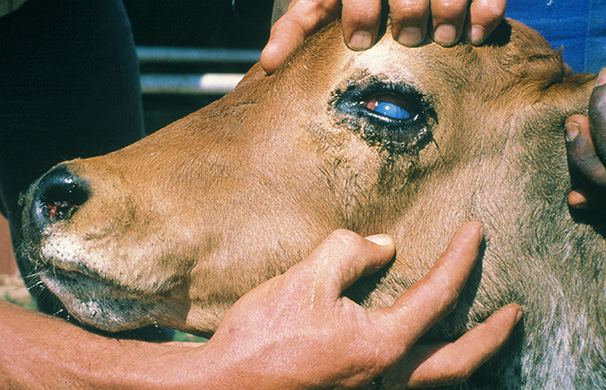 Malignant catarrhal fever (MCF) : lacrimation and exudation from the eyes as well as opaque discolouration of the cornea