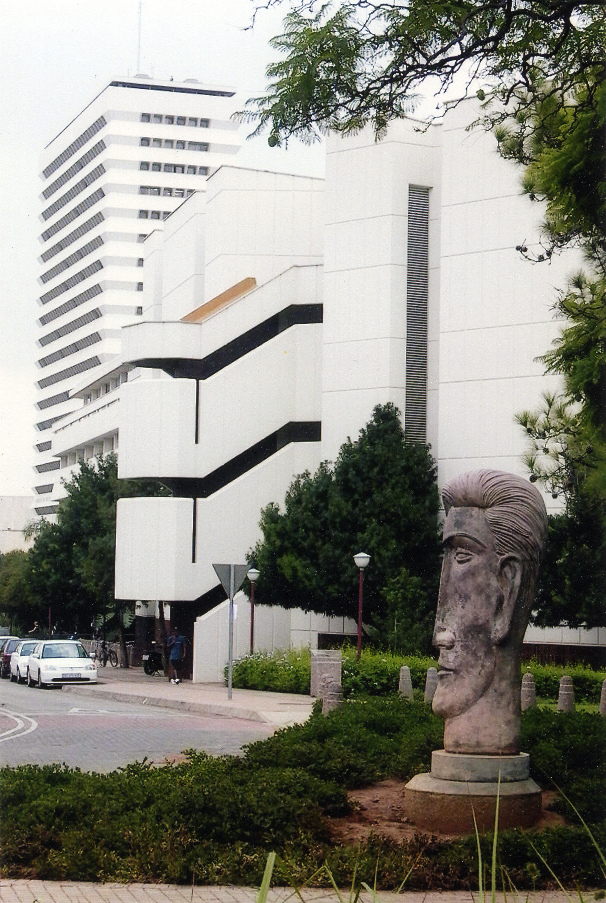 Back view of the Information Technology Building with an art piece, Hatfield Campus, University of Pretoria.