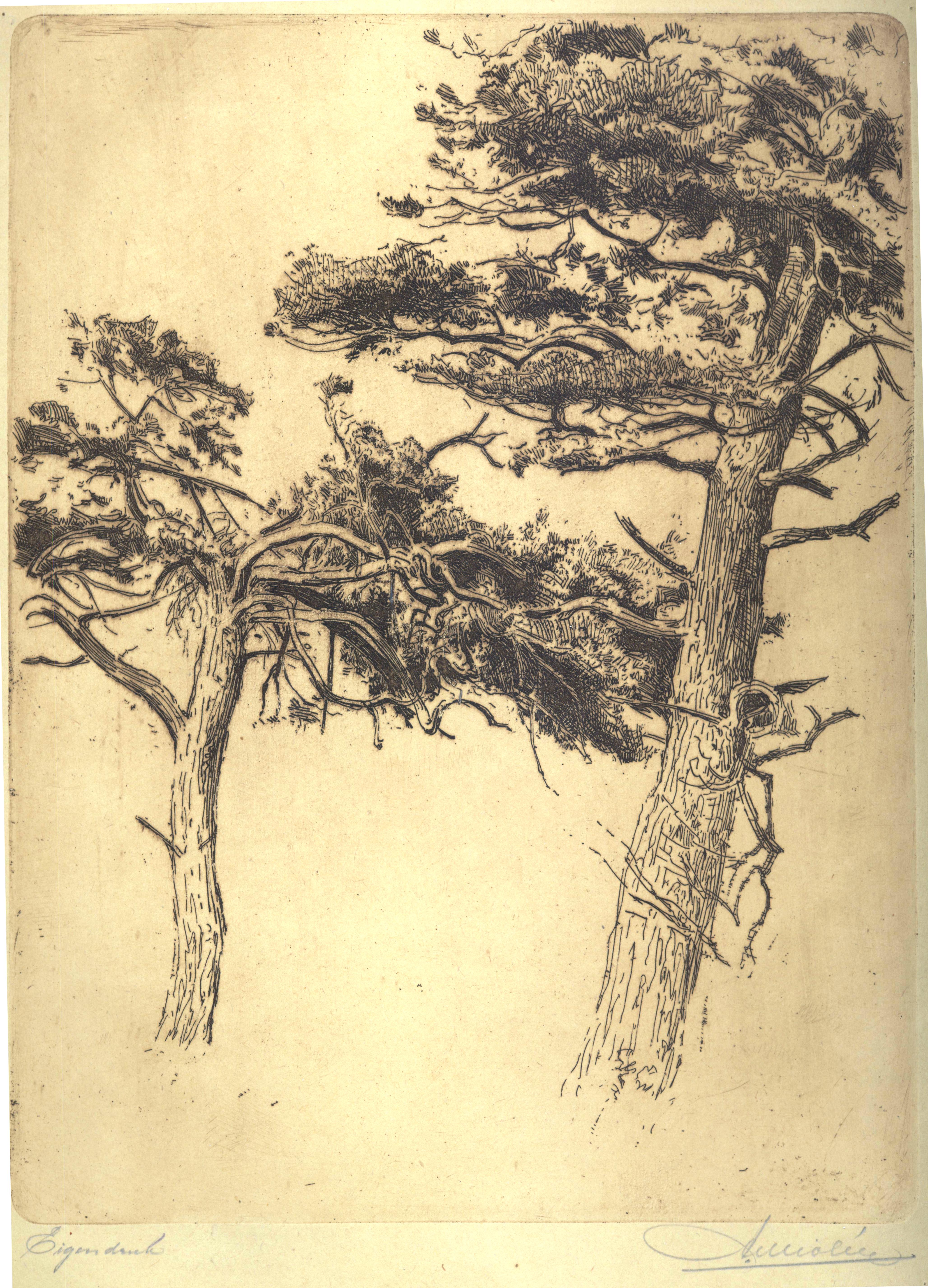 A dry needle etching of two pine trees, signed bottom right in pencil, inscribed "Eigendruk" bottom left, titled and dated on bottom left corner of paper.