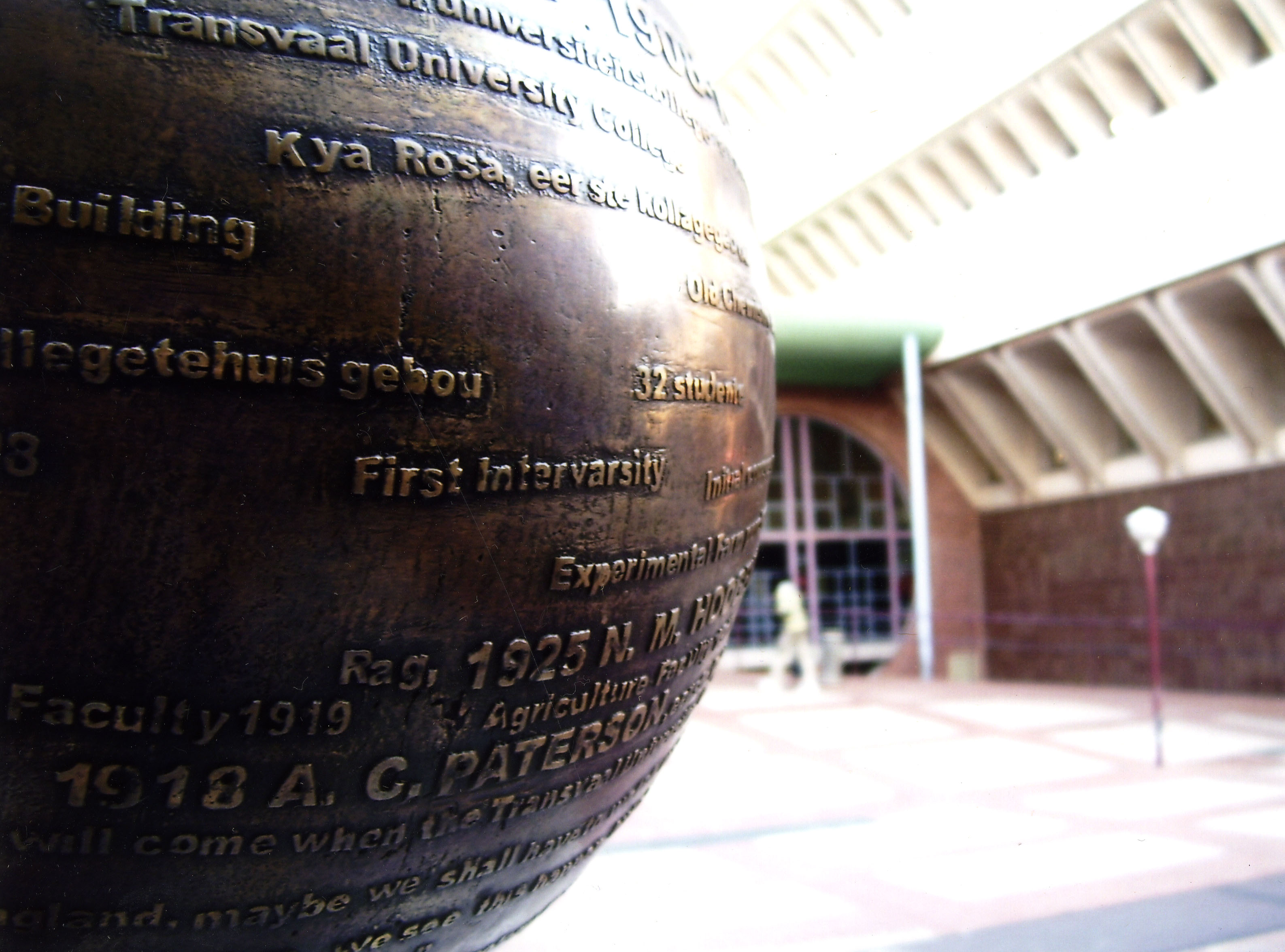 Side view of the Merensky 2 Library behind an art piece, Hatfield Campus, University of Pretoria.