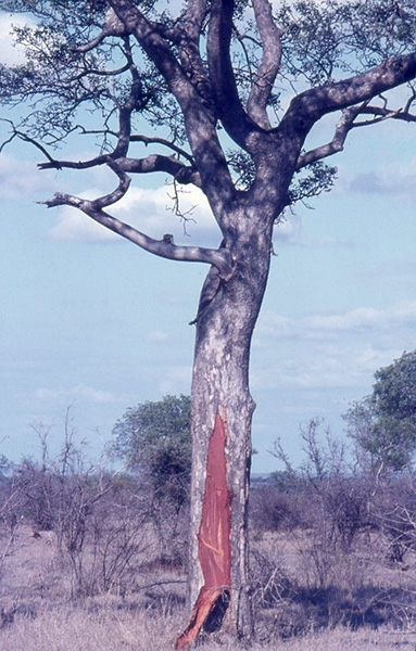 Elephant damage to a tree, Satara, Kruger National Park, South Africa - December 1982