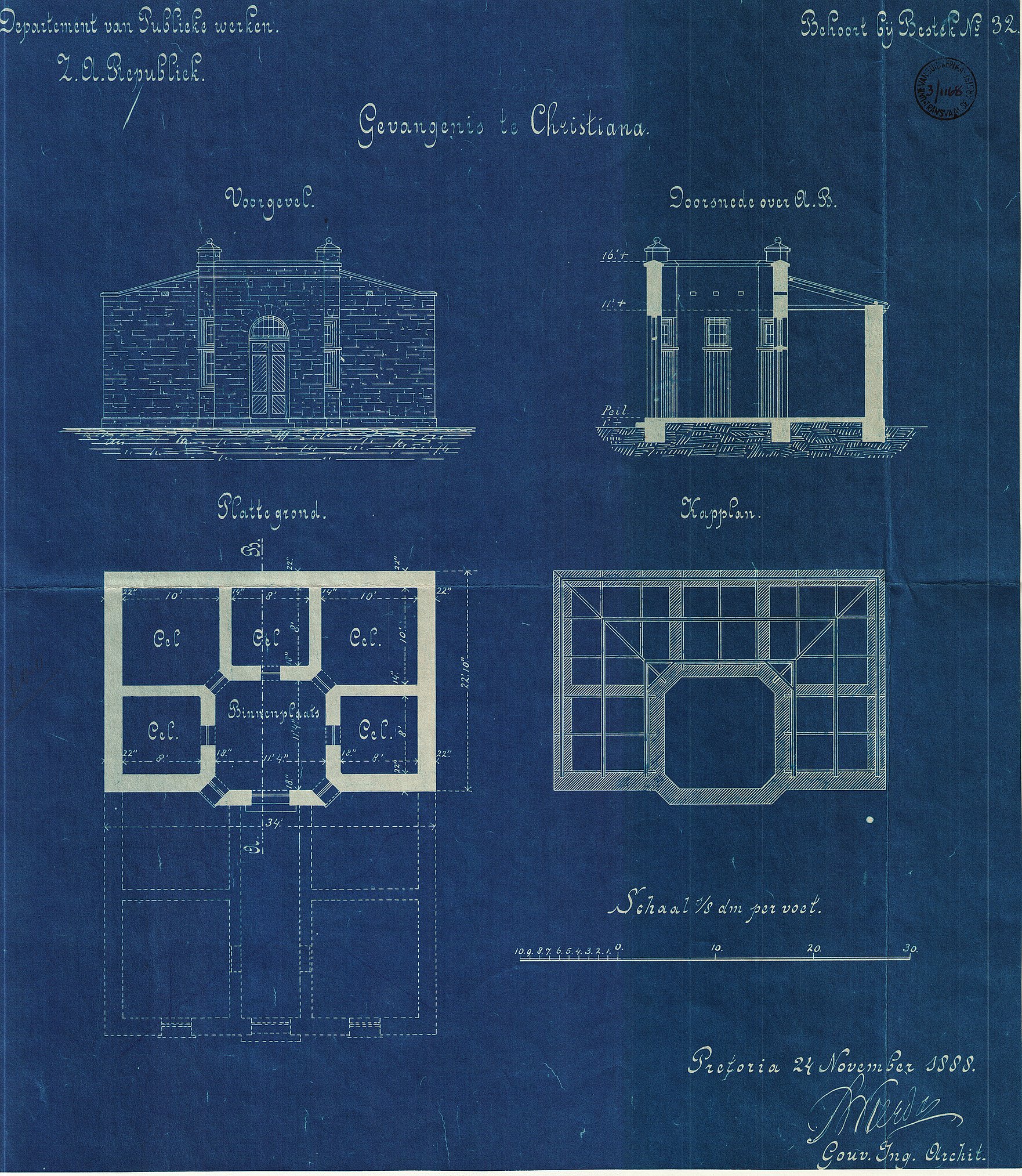 Digitised version of National Archive file S.3/1168. Drawings of prison, Christiana. "Voorgevel, Doorsnede, Plattegrond, Kapplan" (Front Gable, Section, Ground Floor Plan, Truss Plan), signed ny "S.W. Wierda, Gouv. Ing. Archit."