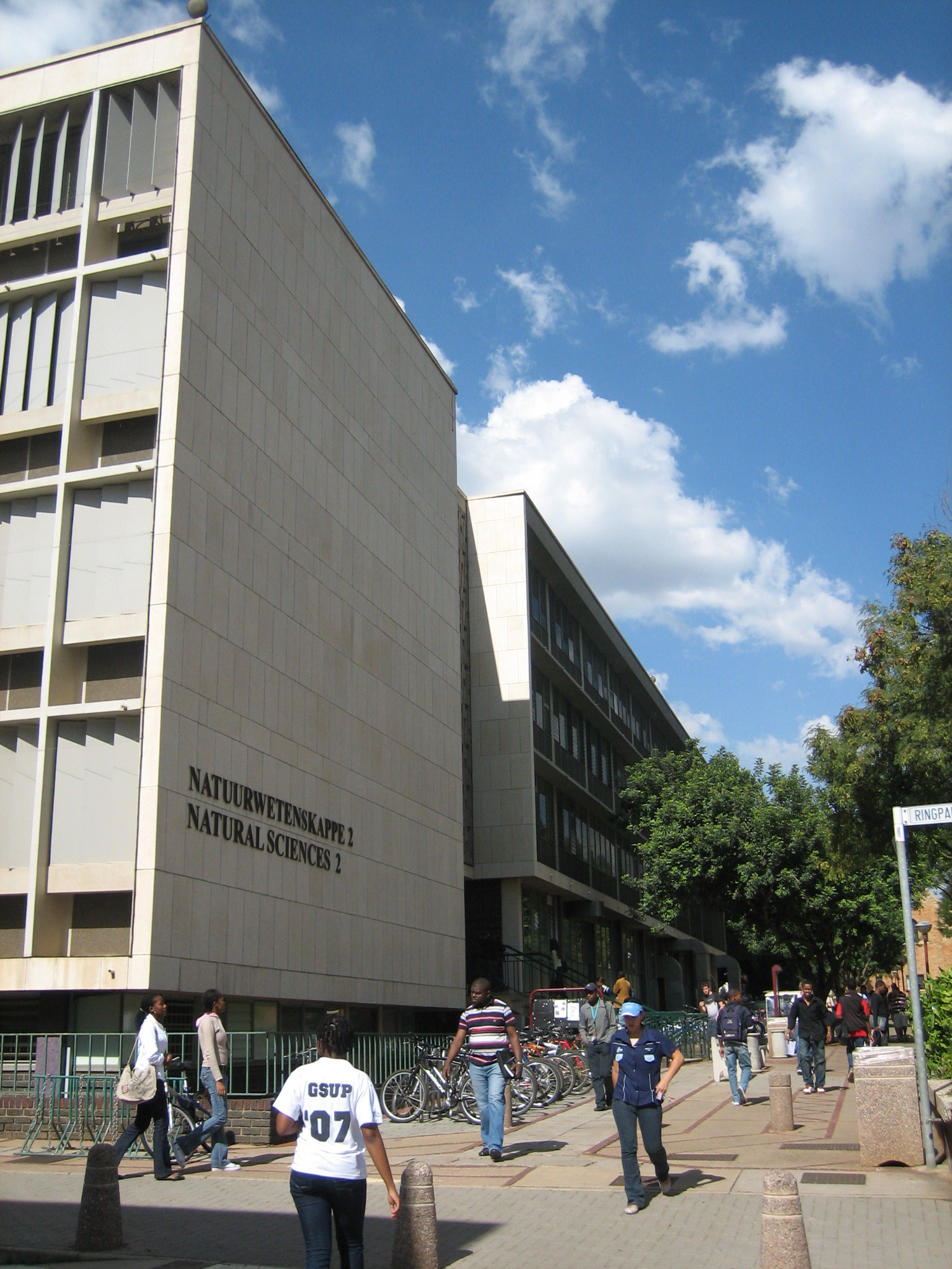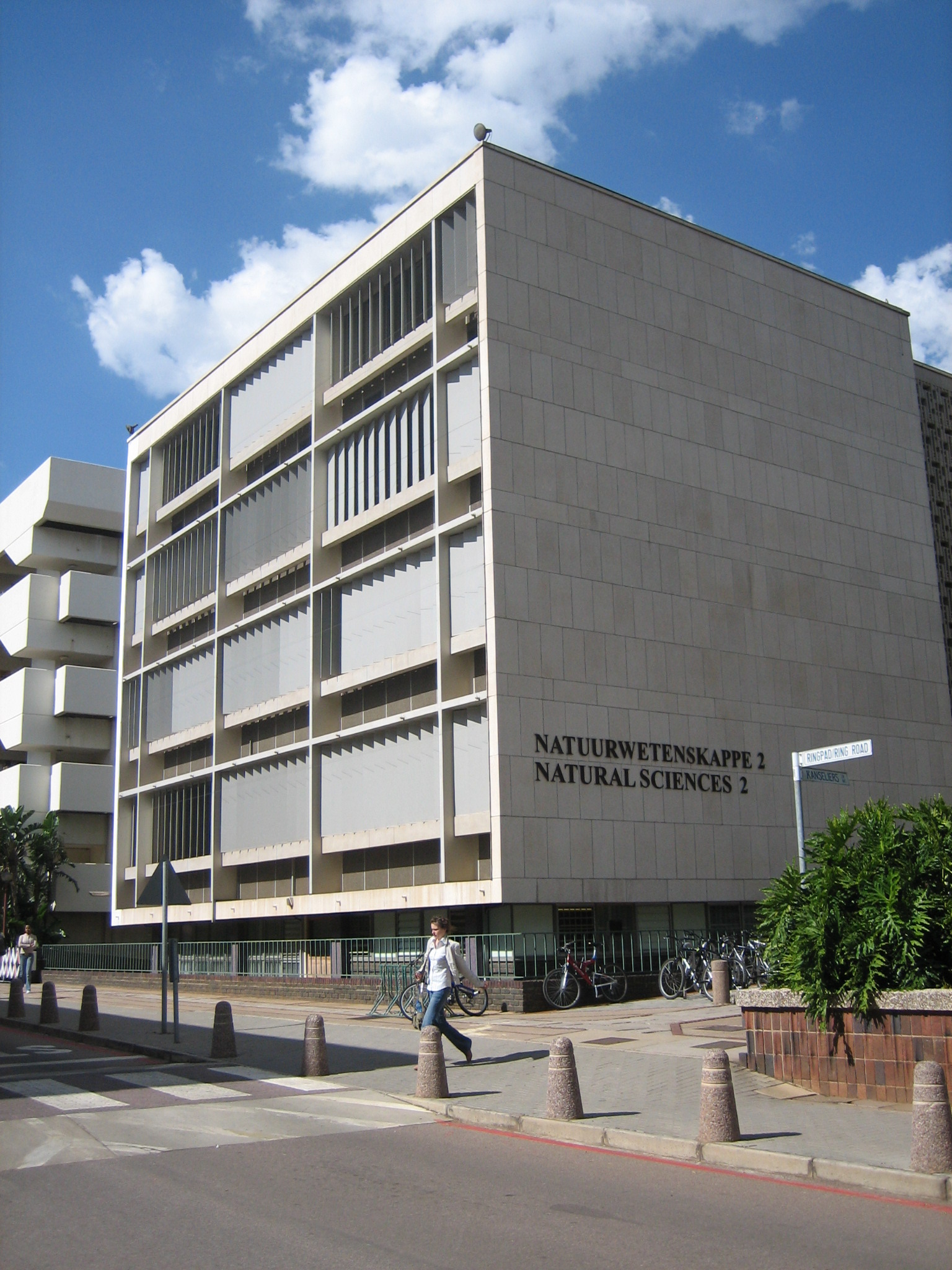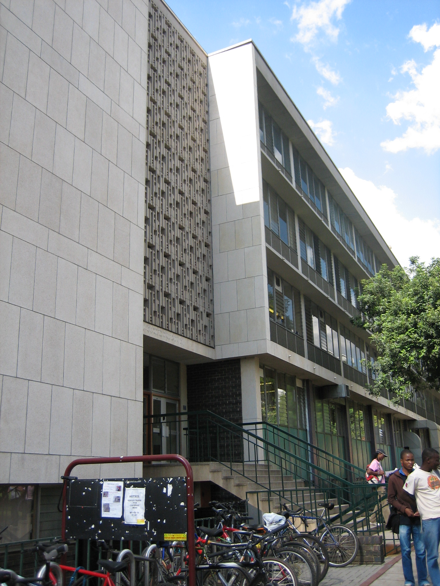 Designed by the architectural firm Meiring and Naude in a style that reflects traces of the Neo-Brutalistic style, the building was constructed in 1961 to provide accommodation for the Departments of Mathematics, Applied Mathematics and Statistics. When Mathematics moved out in 1982, it became know as the Applied Mathematic Sciences building and is currently known as the Natural Sciences II building.