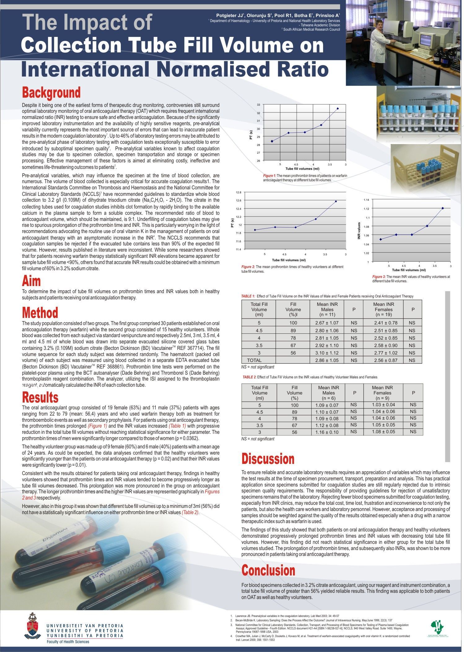 Pre-analytical variability currently represents the most important source of errors that can lead to inaccurate laboratory results in monitoring of patients being treated with oral anticoagulant therapy. The volume of blood collected is critical for accurate coagulation results. The National Committee for Clinical Laboratory Standards (NCCLS) recommends a ratio of blood to anticoagulant volume of 9:1. However, investigators have published reports which suggest that a lower ratio may be acceptable. Unfortunately the recommendations of these reports were inconsistent. AIMS: The aim of this study was to determine the impact of tube fill volumes on prothrombin times and INR values both in healthy subjects and patients receiving oral anticoagulation therapy. METHODS: An experimental study was performed to compare INR values obtained by processing coagulation specimens containing different volumes of whole blood. The study group included 30 patients taking oral anticoagulation therapy and 15 healthy volunteers. Respectively 2.5ml, 3 ml, 3.5 ml, 4 ml and 4.5 ml of whole blood was drawn into tubes containing 3.2% (0.109M) sodium citrate. A prothrombin time test was performed on the platelet-poor plasma of each collection tube and the INR subsequently calculated. RESULTS: The INR values increased as total tube fill volumes decreased for both groups but this finding did not reach statistical significance in either group for the tube fill volumes studied. CONCLUSION: For blood specimens collected in 3.2% citrate anticoagulant using our reagent and instrument combination, a total tube fill volume of greater than 56% yielded reliable INR results.