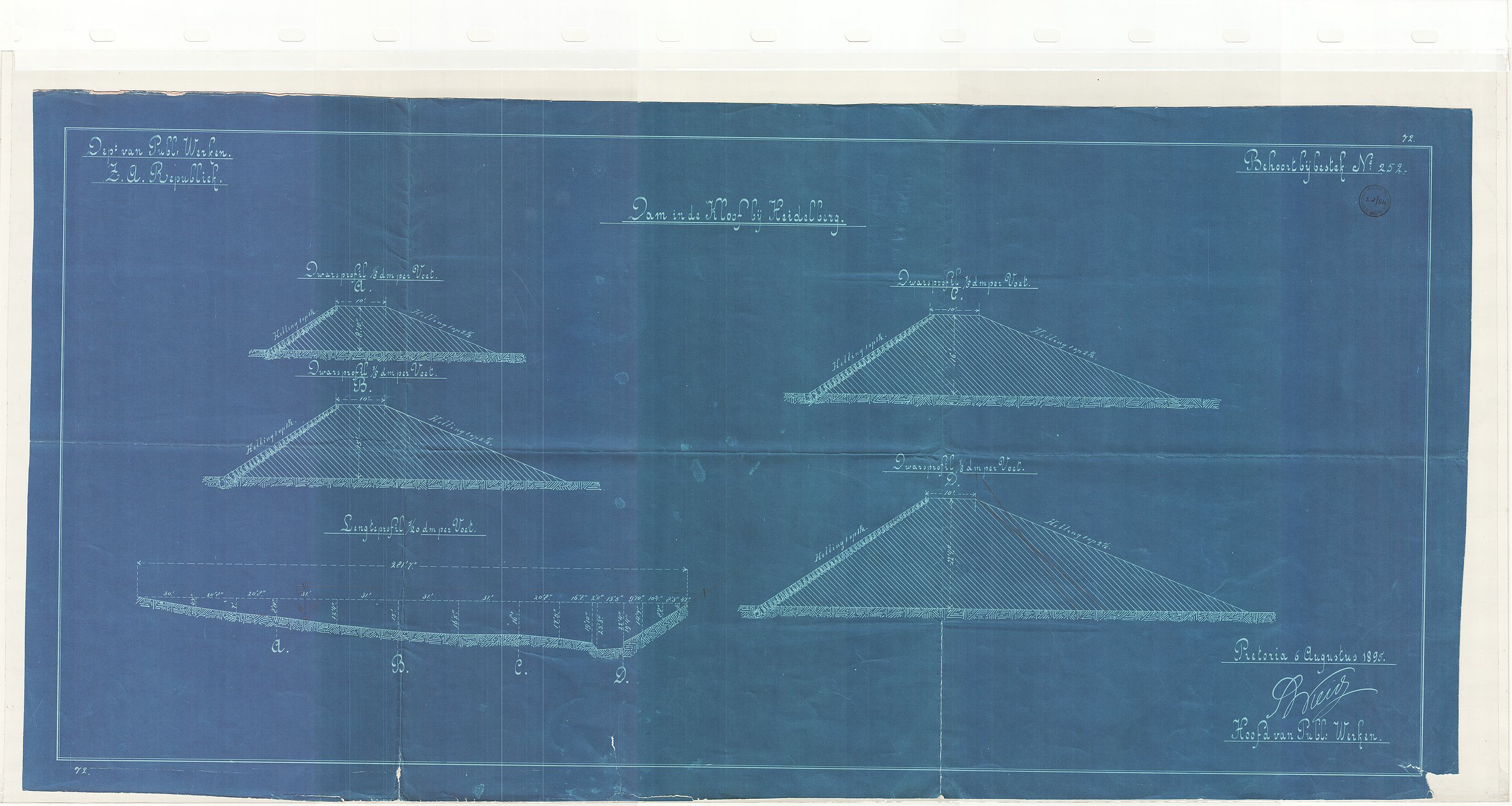 Digitised version of National Archive file S.2/84 of the dam in the Kloof, Heidelberg, signed by "S.W. Wierda, Hoofd van Dept. van Publieke Werken"