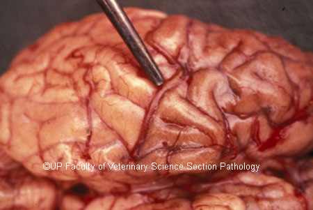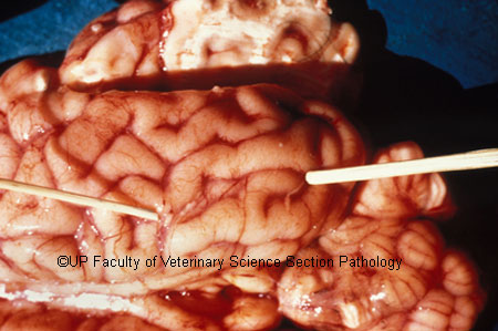 Turning sickness or cerebral theileriosis is an uncommon aberrant form of infection by Theileria parva or Theileria taurotragi in which lymphoblasts parasitized by schizonts accumulate in cerebral vessels leading to thrombosis and infarction. Turning sickness occurs sporadically and usually in cattle younger than 3 years old. The thrombosed meningeal blood vessel is easily seen on this slides.