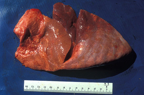 Consolidation of the distal lobes of the lungs in a new-born calf born due to Brucella abortus bovis infection