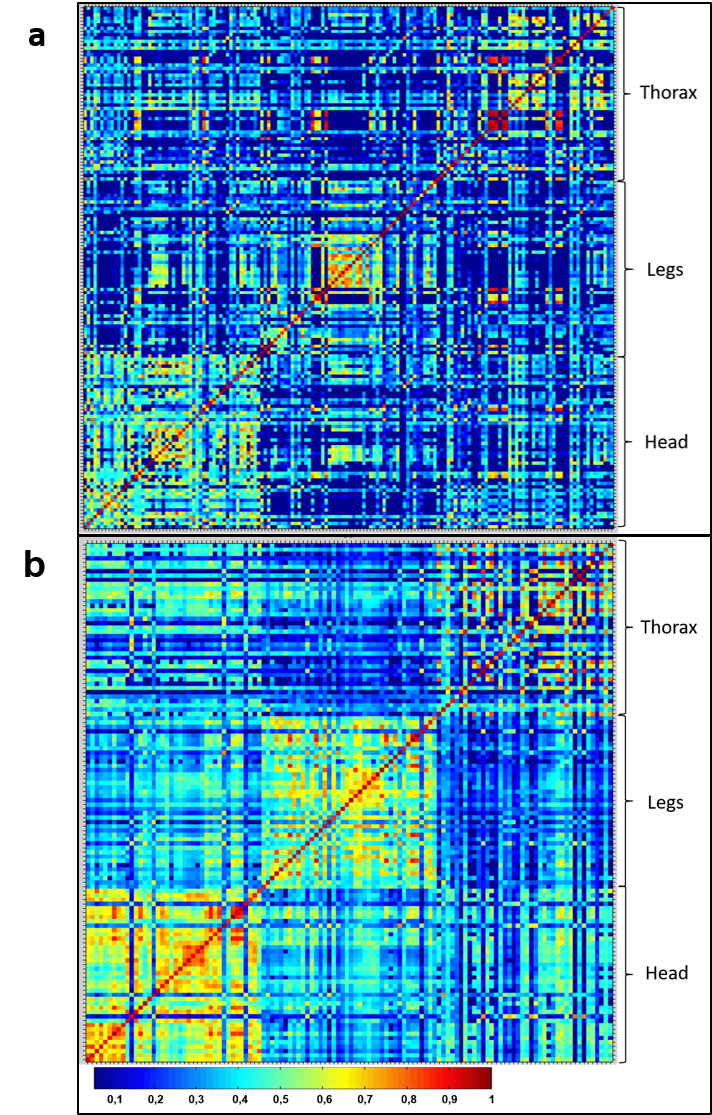 Additional file 3: Fig. S3. Composite correlation index (CCI) heat map grid of mass spectrum protein profiles of Anopheles gambiae. Panel A from Mali, n=52 (a). Panel B from Guinea, n=40 (b). Levels of mass spectral reproducibility are indicated in blue and red, revealing incongruence and relatedness between spectra, with a correlation index variation between 0 and 1, respectively. The coloured squares of the central diagonal reflect the degree of reproducibility of each mass spectrum when compared to itself. Around the central diagonal, spectra from various specimens of Anopheles gambiae were compared. The CCI matrix was calculated using MALDI Biotyper v4.1 software with default settings.