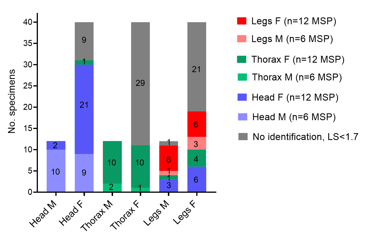 Additional file 4: Fig. S4. Impact of body part on identification results using panels A+B versus database 1, n=92. The number of specimens having correct species identification, error of species identification and absence of identification due to an LSV<1.7 are shown in different colours for each body part.