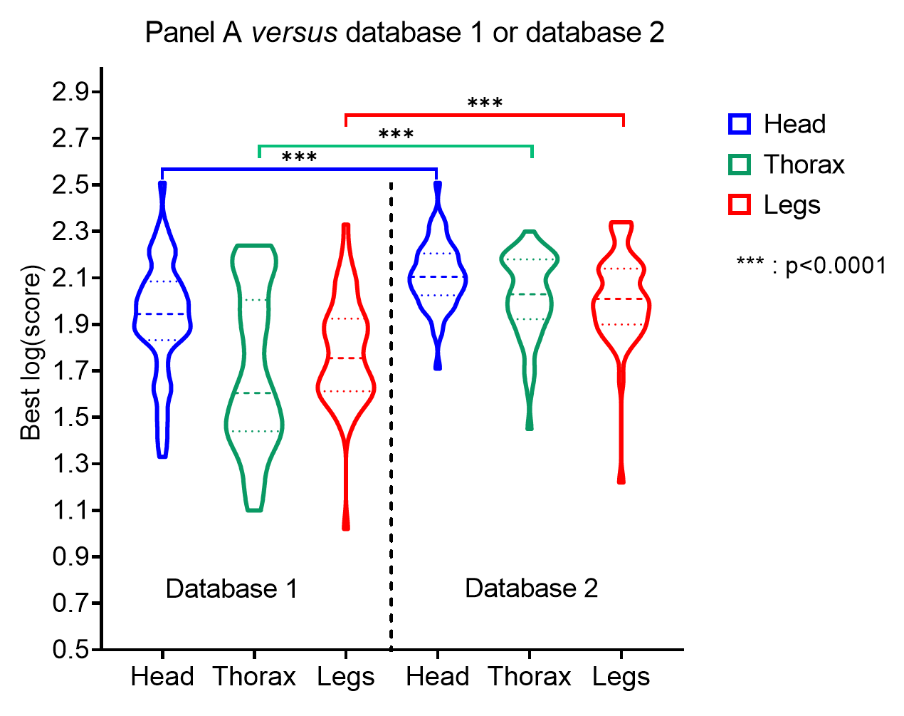 Additional file 7: Fig. S7. Distribution of spectral log(scores) from heads, thoraces and legs. Panel A versus database 1 or database 2, n=52. Violin plots showing the distribution taking into account the densities of the points for the different log(score) values. The median score is represented with dashes, and the quartiles are represented by dashed lines.