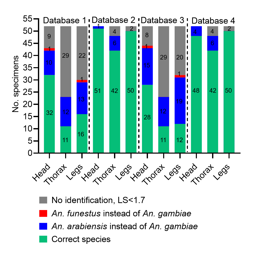 Additional file 8: Fig. S8. Identification results, panel A versus database 1, database 2, database 3 or database 4, n=52. Database 1 was created using n=20 non-engorged laboratory-reared Anopheles and field specimens from the collection of reference centres. Database 2 was created by adding 10 Anopheles specimens collected from the field in Mali to database 1. Databases 3 and 4 were created by adding 10 field specimens from Senegal to databases 1 and 2, respectively. The number of specimens having correct species identification, error of species identification and absence of identification due to an LSV<1.7 are shown in different colours for each body part.
