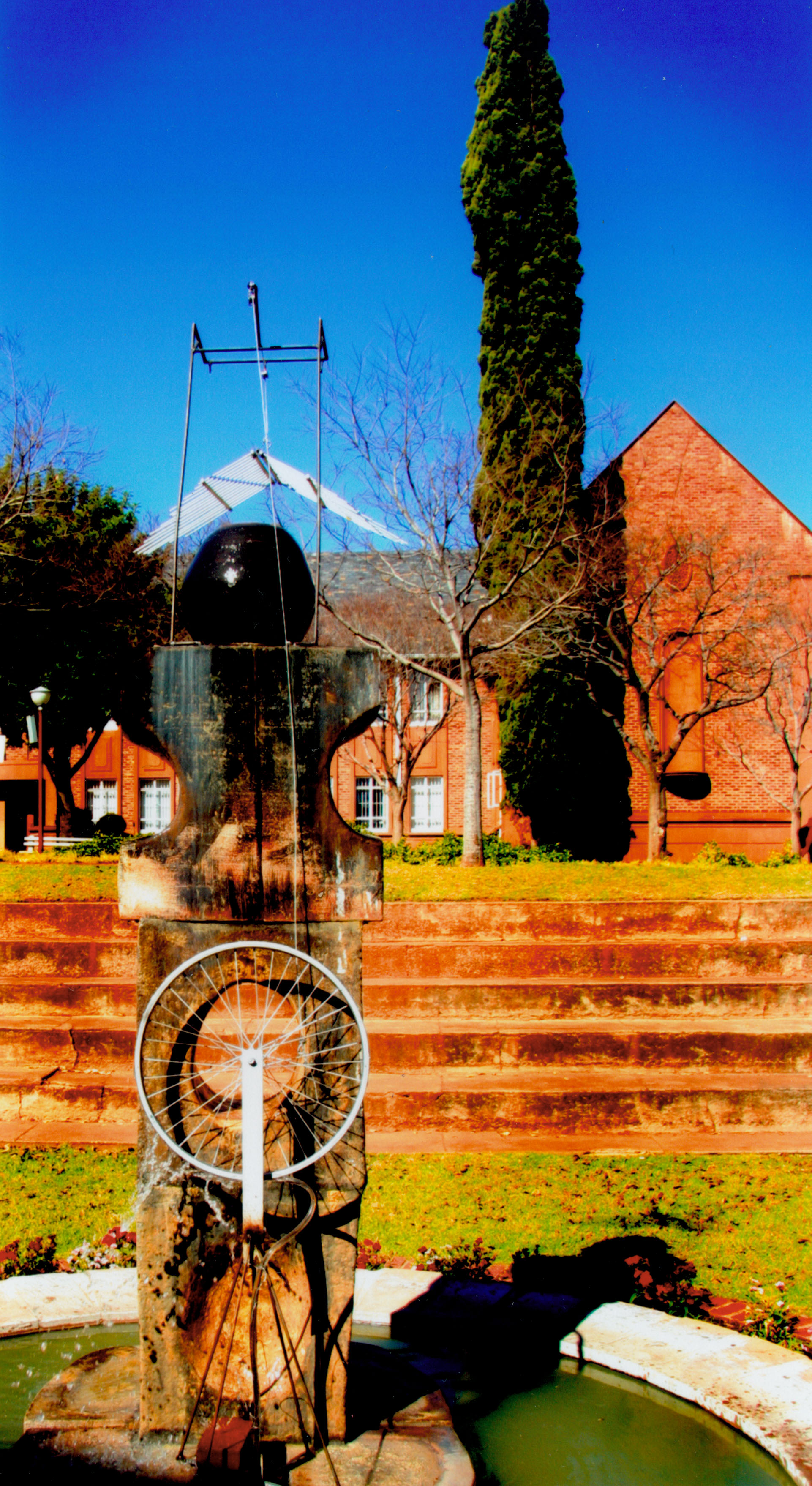 Distant front view of the Theology Building with an art piece at the front, Hatfield Campus, University of Pretoria.