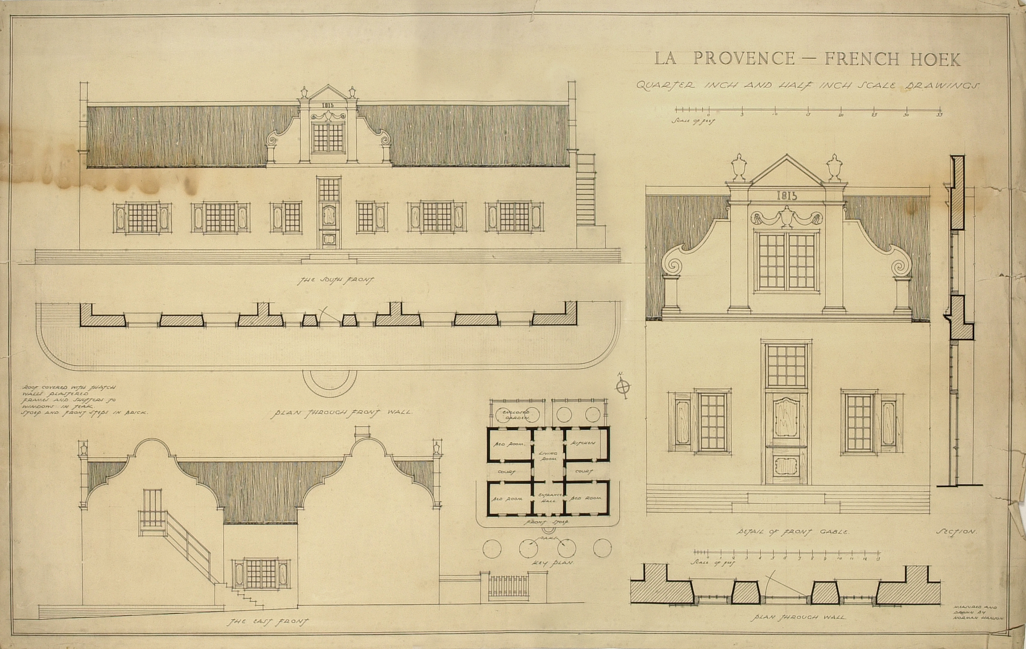 | dc.description.abstract | Plan, and north and south elevations of La Provence, a Cape Dutch homestead near Franschhoek. Includes detail of the necked front gable. Drawn and measured by Norman Hanson for prof. Geoffrey Pearse's book "Eighteenth Century Architecture in South Africa" - see page 47 for a description, and Plate 93 for the drawing. | en_US |