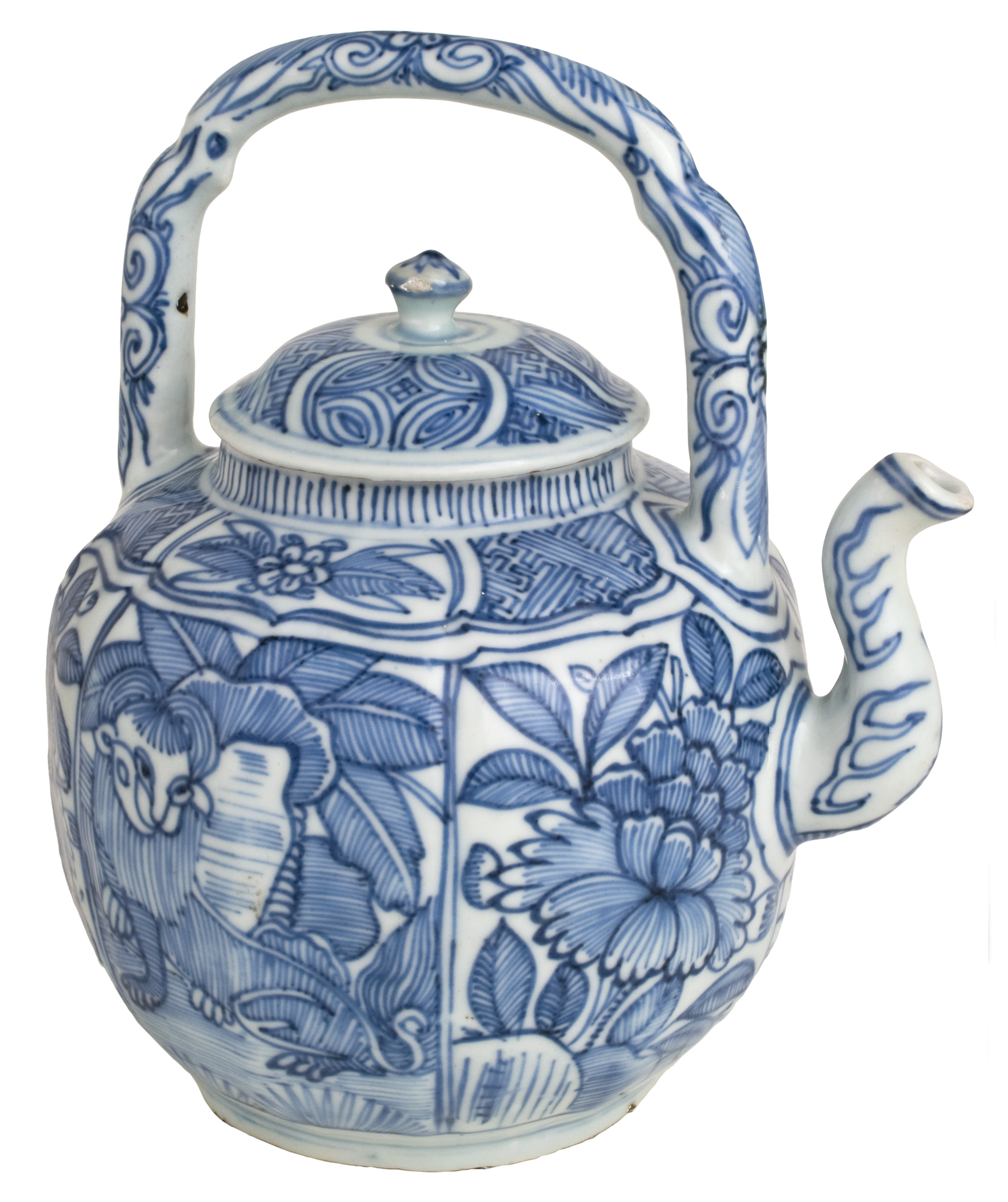 This porcelain wine ewer with a curved spout and overhead handle is decorated in pale silvery underglaze blue with alternating panels of flowers and qilin and formal patterns round the neck and on the lid. The base is sunken, glazed and unmarked. A qilin is a fabulous creature which appears in various forms and is associated with the wish for sons. In Europe it is sometimes described as a unicorn. Similar wine ewers were recovered from the cargo of the Witte Leeuw, lost off St Helena in 1613.