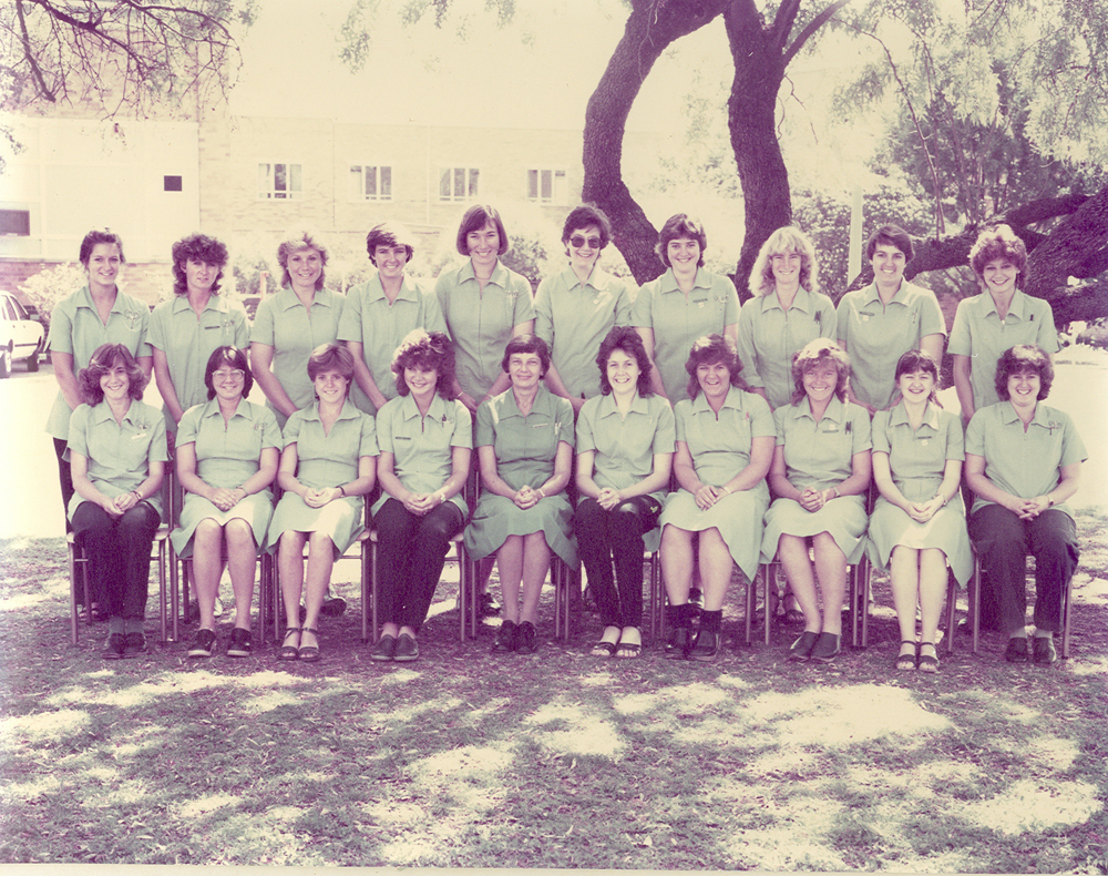 Formal colour photo taken outdoors of the 1985 DVN class with Dr Ingrid Wolleschak. The names of the veterinary nurses on the photo are: Front (from left to right): J Butkow, SE Korpel, MJ Impey, D van Zyl, Dr I Wolleschak, CL le Cornu, L Swart, JM McGregor, M du Preez, MS Davis ; Second row: JA Rankin, KGM Sharpe, MJ Coetzee, SM Brewin, Z Streicher, HR Otto, S van Rooyen, AH Craye, DL Visagie,