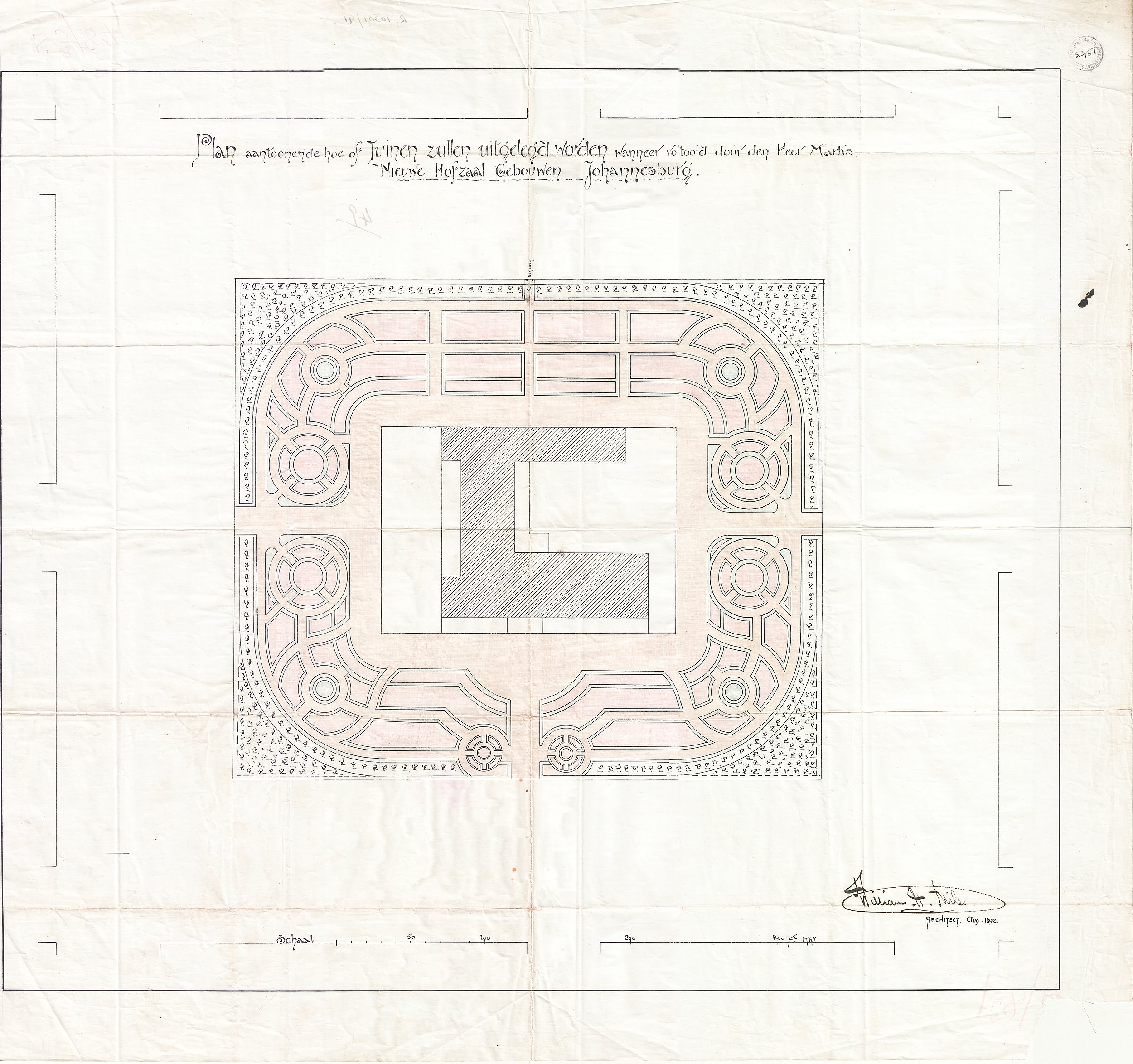 Plan aantoonde hoe of tuinen zullen uitgelegt worden wanneer voltooid door den Heer Marks, Nieuwe hofzaal gebouwen, Johannesburg