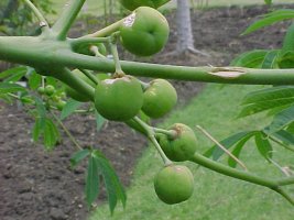 Fruit: Egg-shaped, dark brown, splitting open to reveal 2 -3 black seeds.